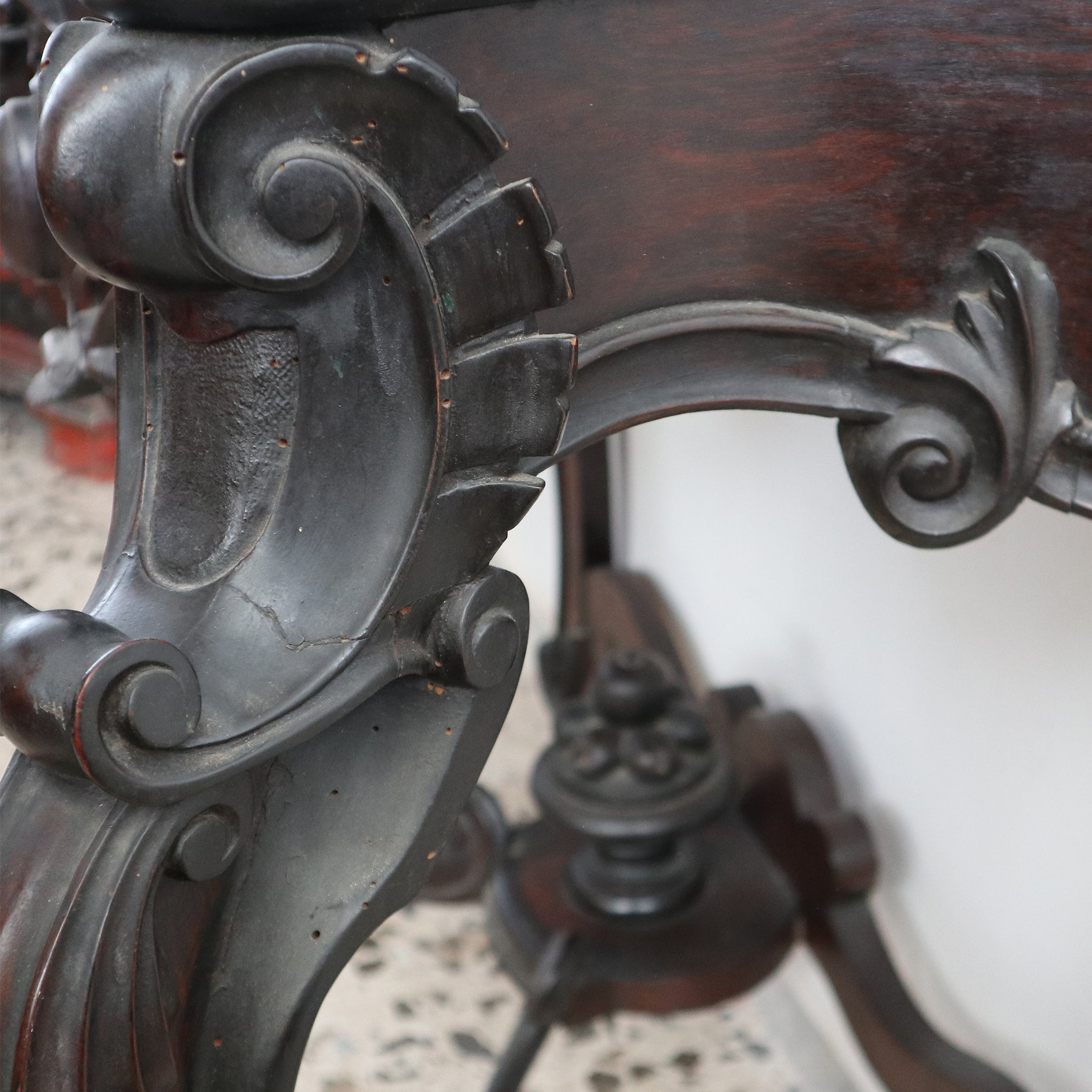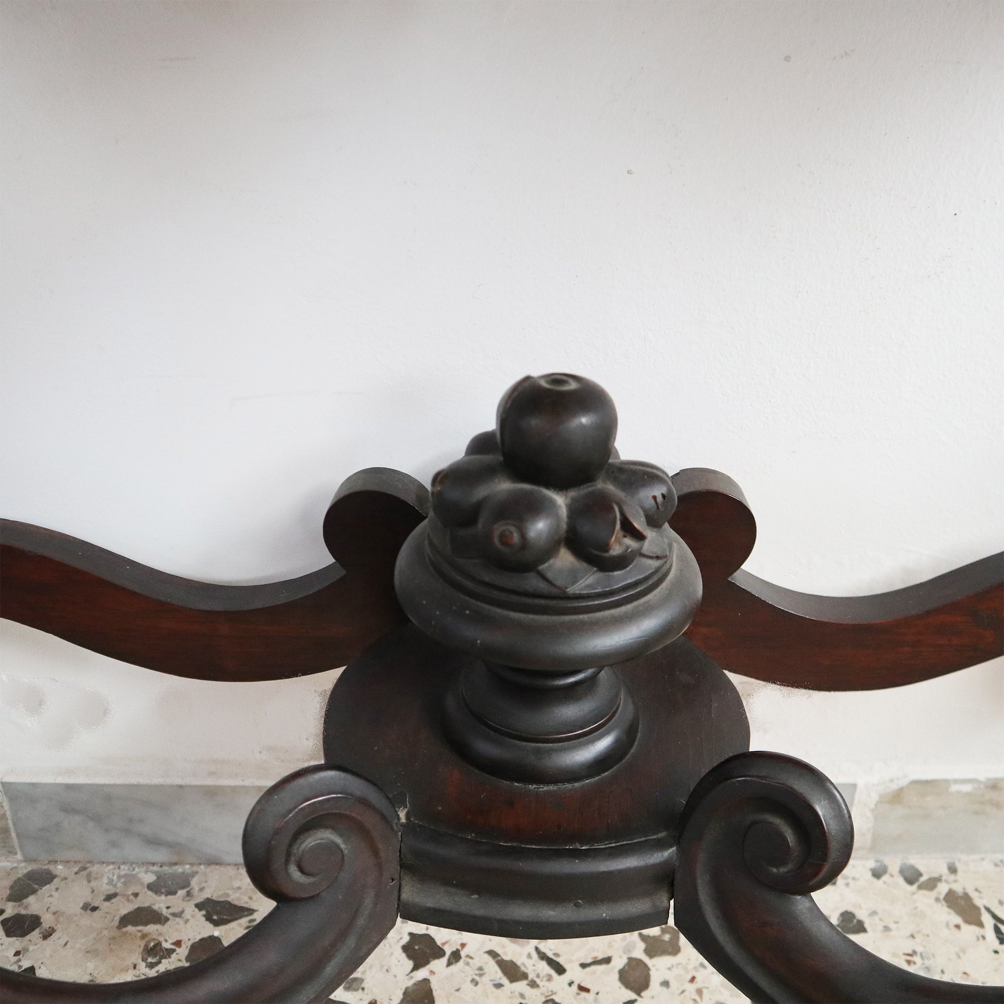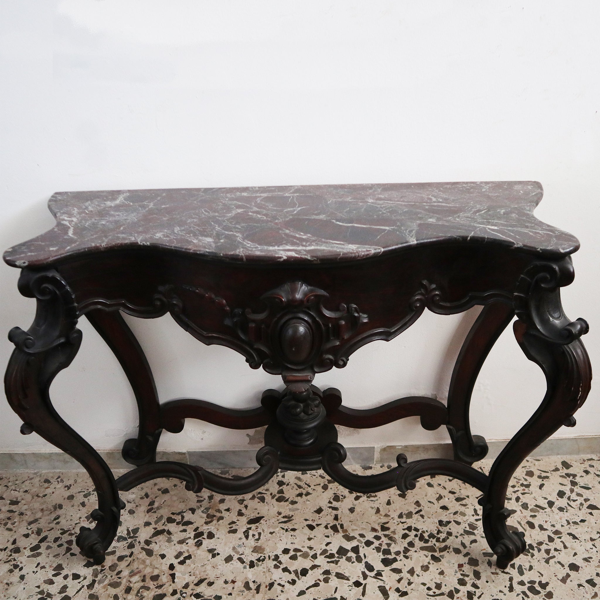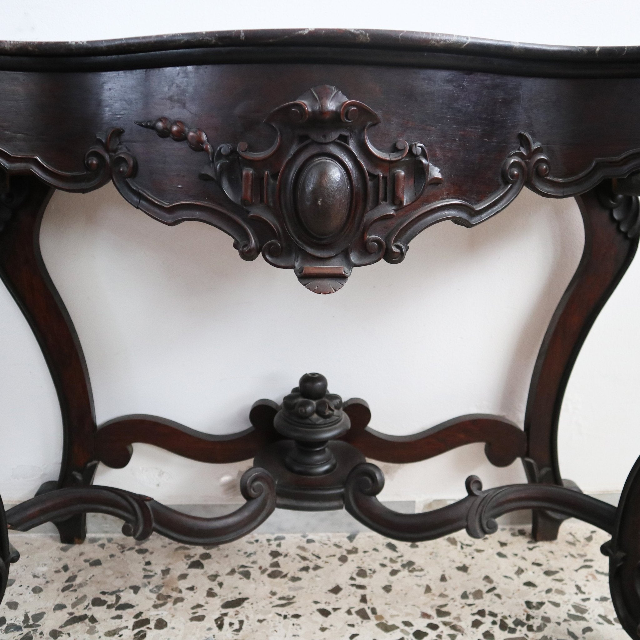 Die Platte wird von einem geschwungenen Unterbau mit bewegter Vorderseite und zentralem, geschnitztem Fries getragen.