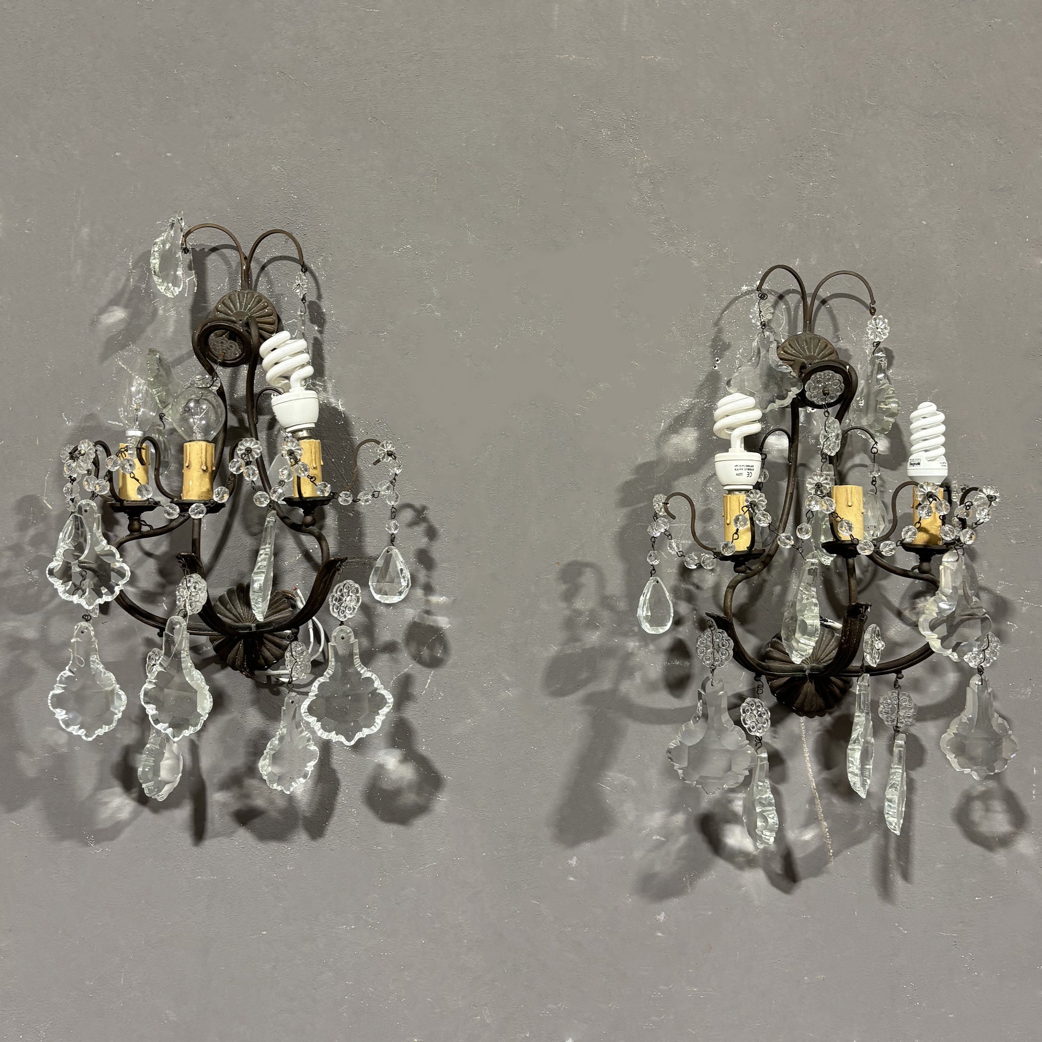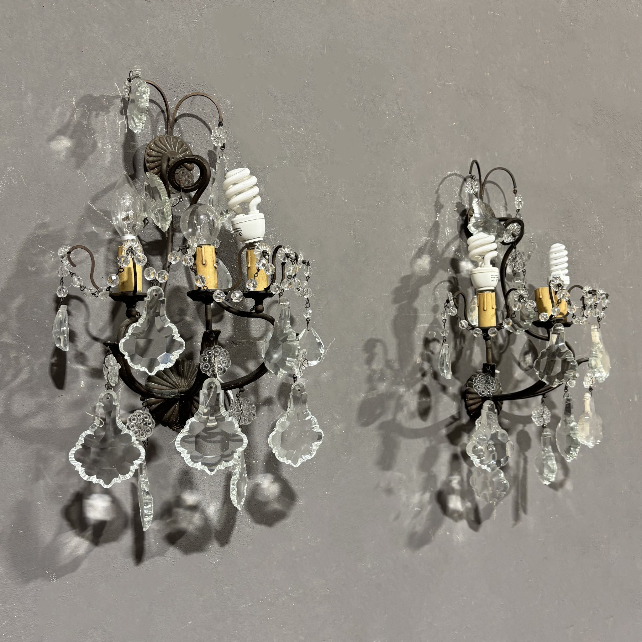 Ogni applique è illuminata da tre punti luce e impreziosita da una cascata di pendenti trasparenti di diverse forme e dimensioni, tra cui pendenti a losanga e gocce allungate.