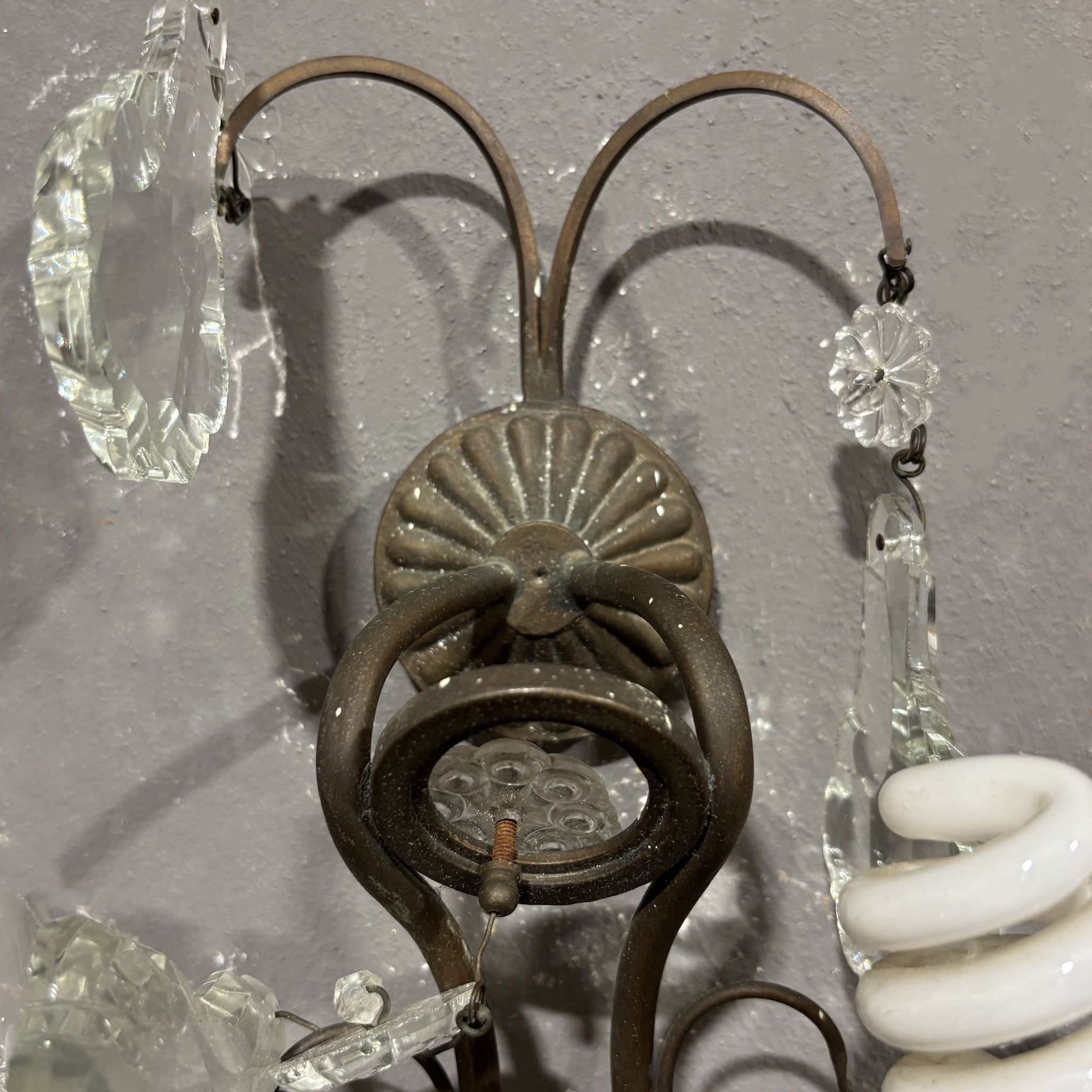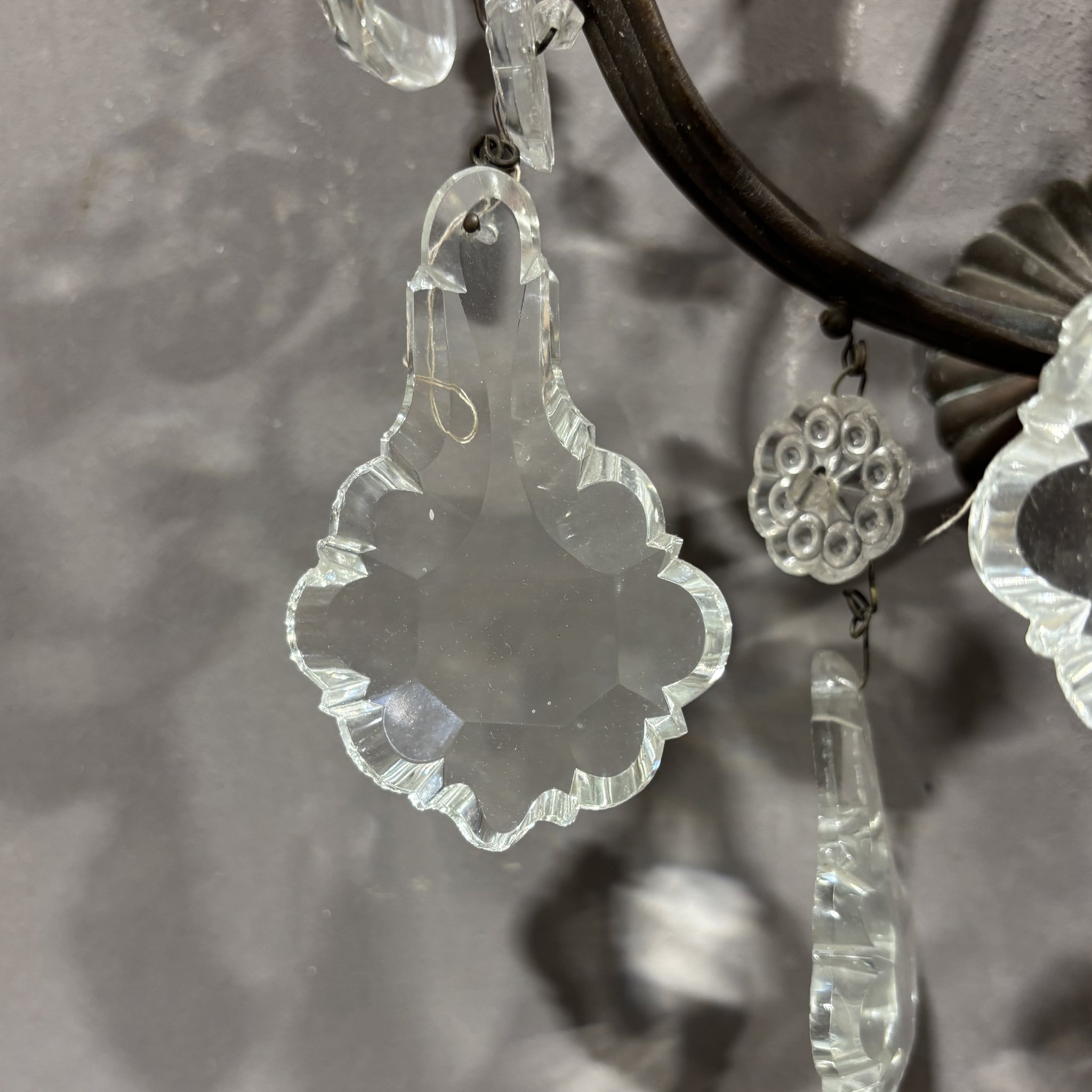Splendida coppia di appliques in stile Liberty, realizzate in bronzo brunito e pendenti in vetro molato.
