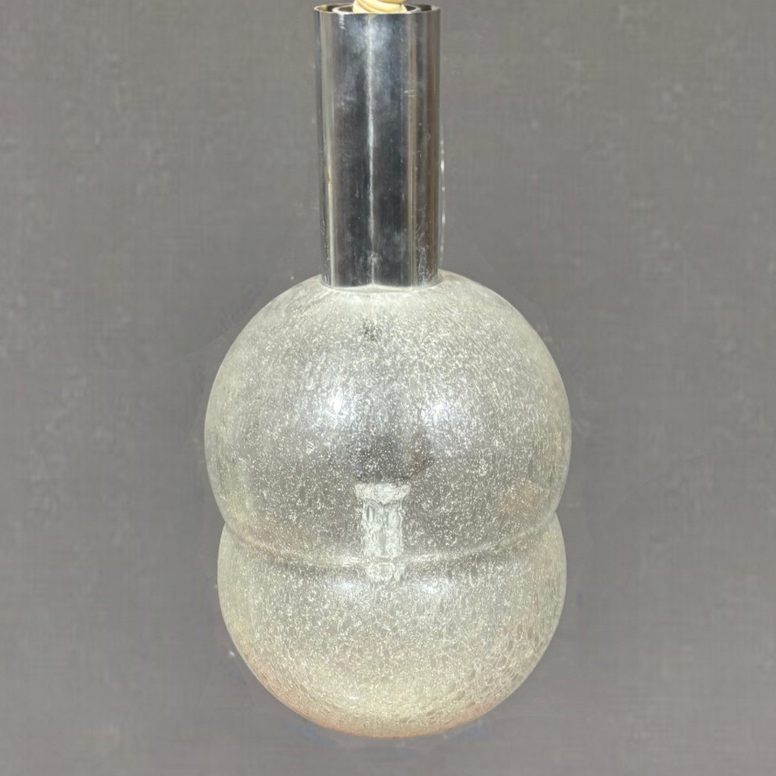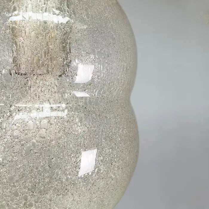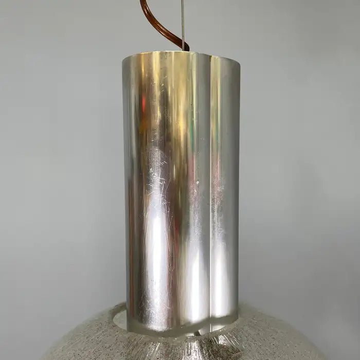 Lampadario mod. Bilobo con diffusore arrotondato in vetro bollicine di Murano. La struttura che sostiene il diffusore è in alluminio. Attacco a soffitto a forma di cupola in plastica bianco crema.  Prodotto da Flos negli anni '60 e disegnato da Tobia Scarpa. Buone condizioni.