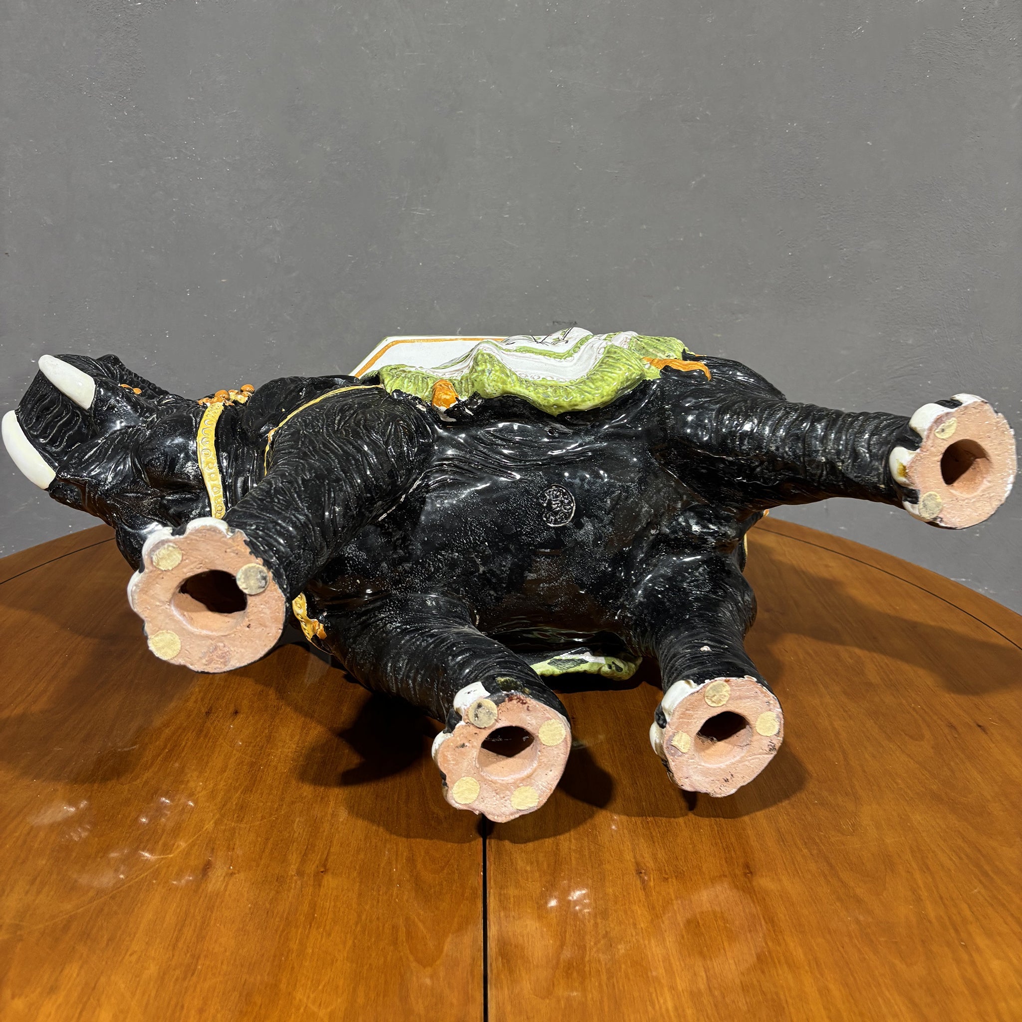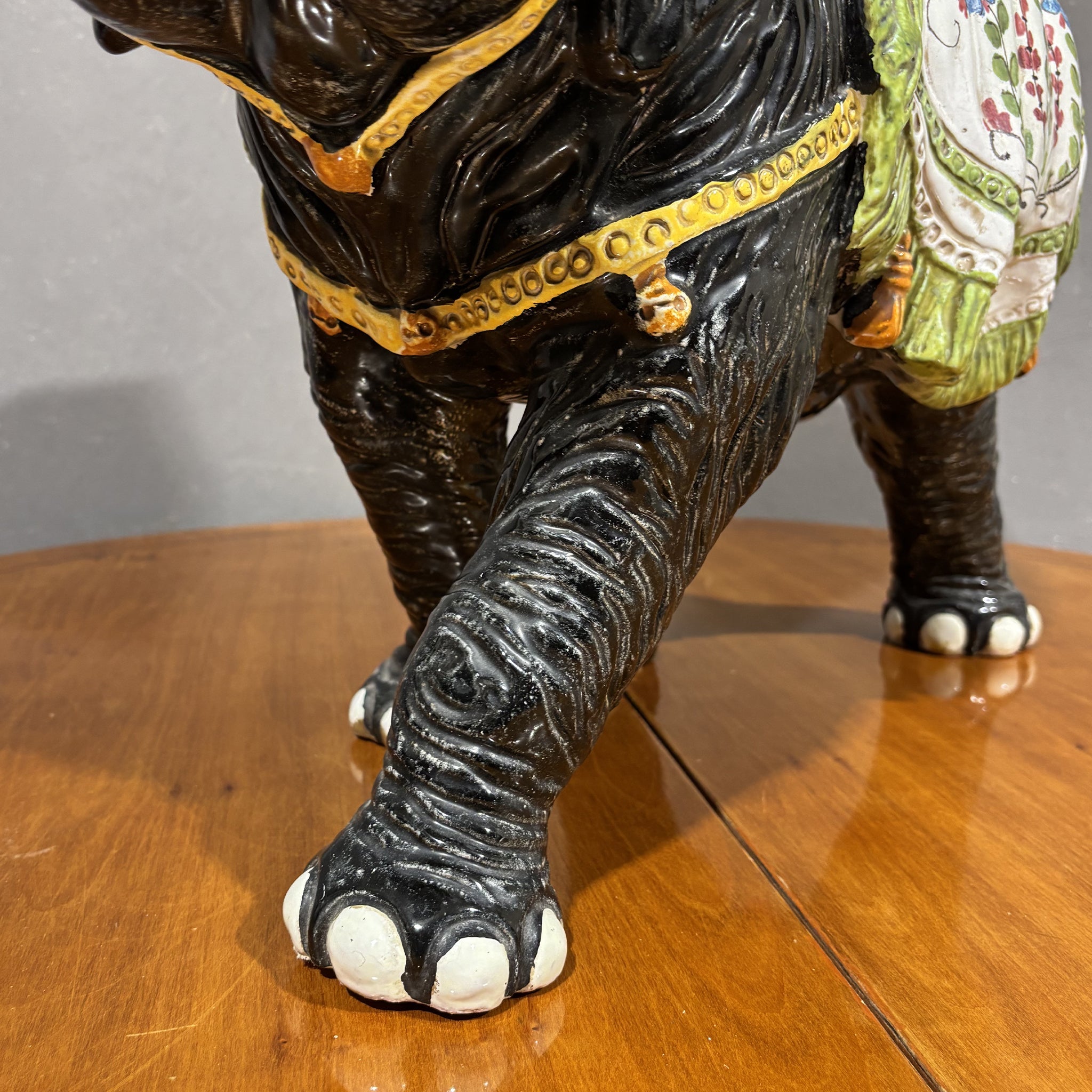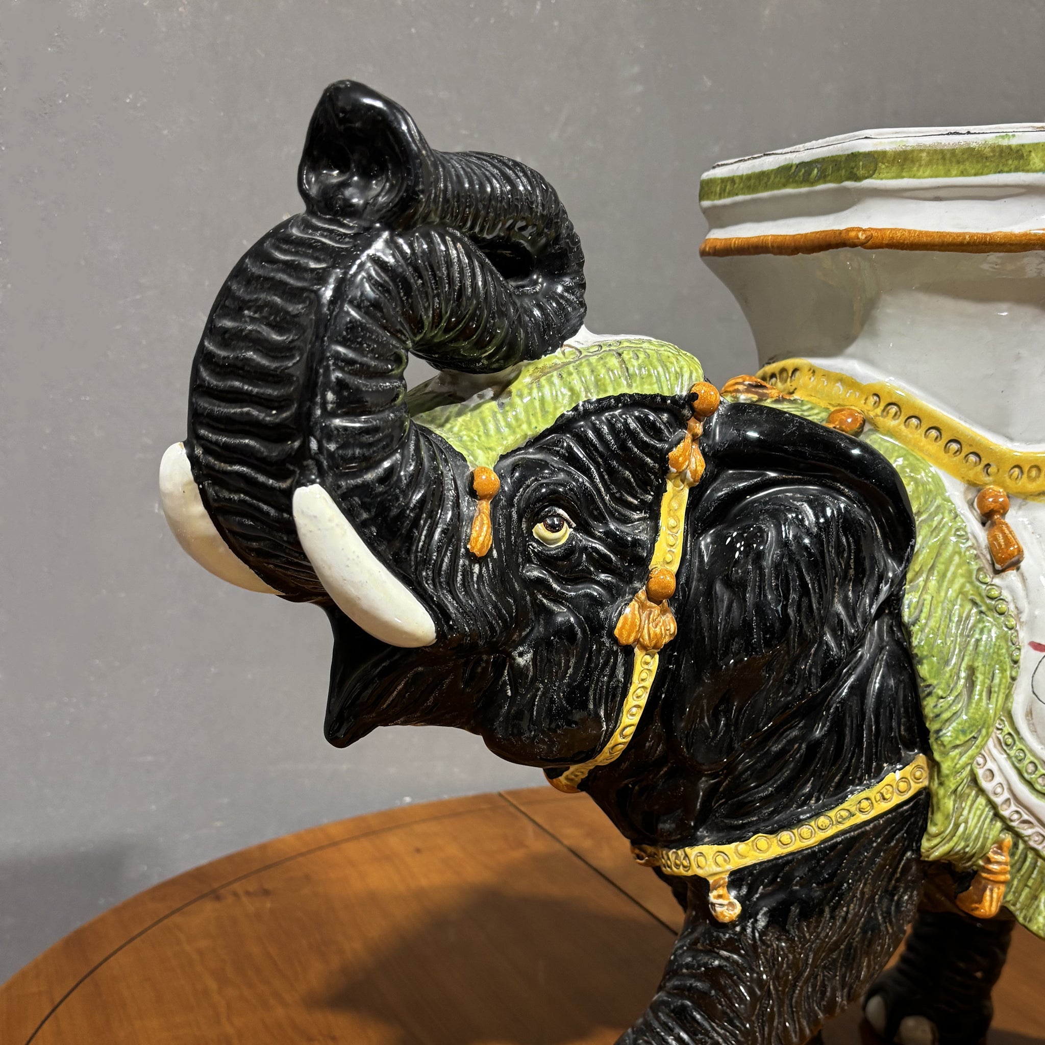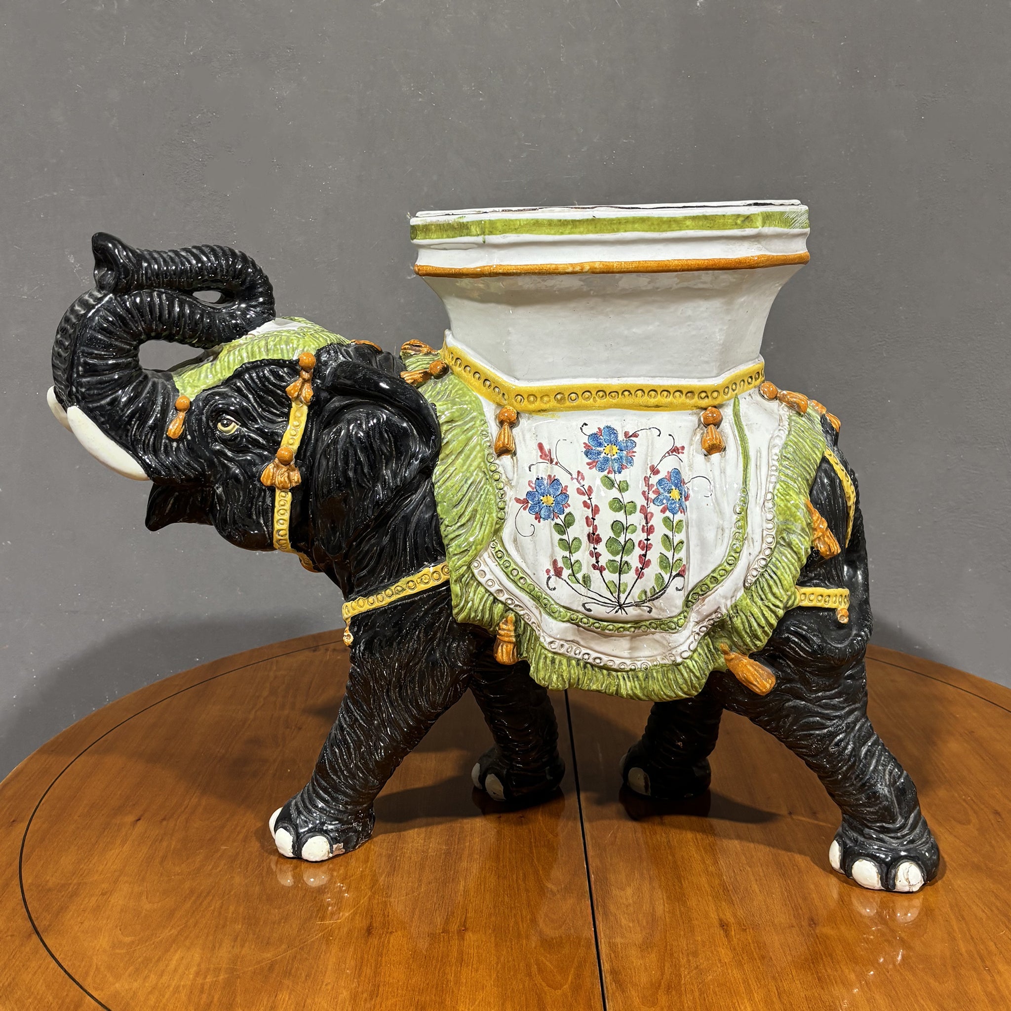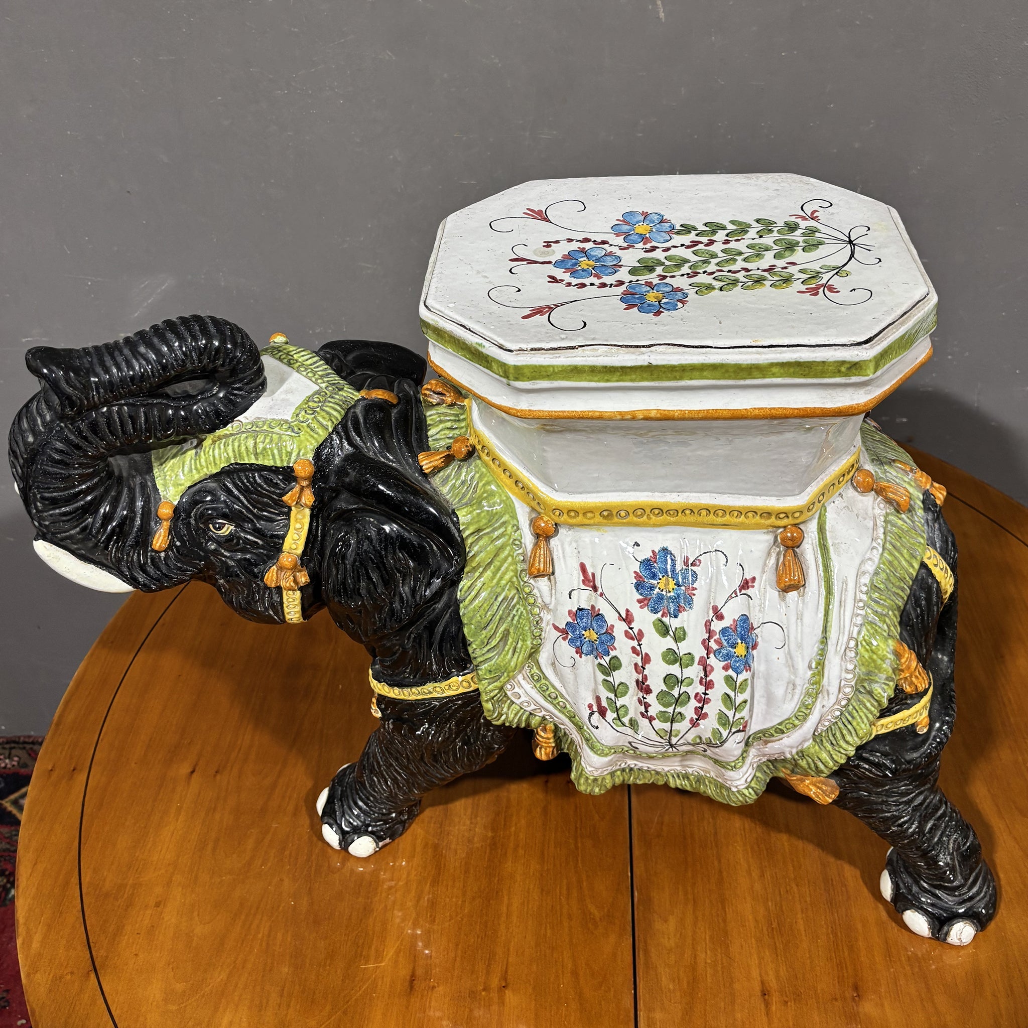 Bellissimo portavaso o stool in ceramica smaltata raffigurante un elefante bardato con ricchi ornamenti in stile orientale, con vivaci motivi floreali e bordature dorate.