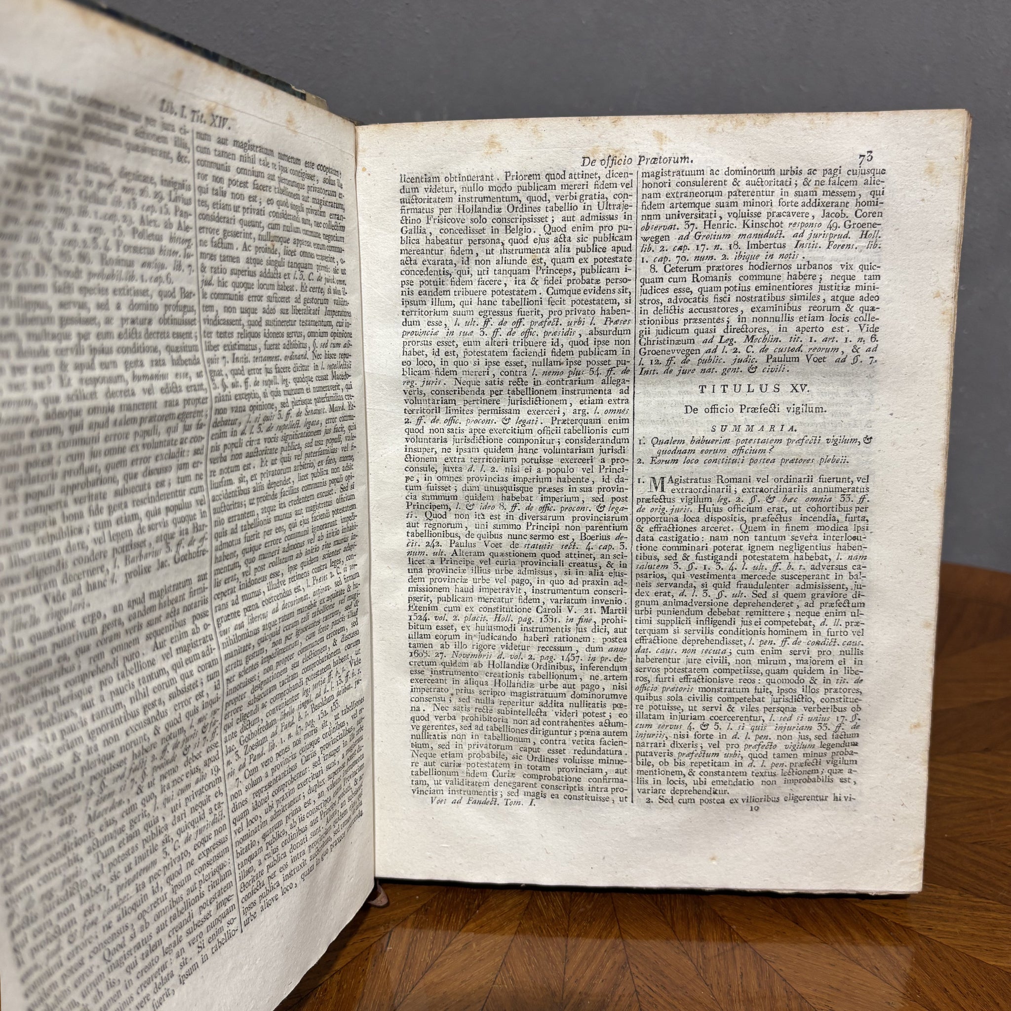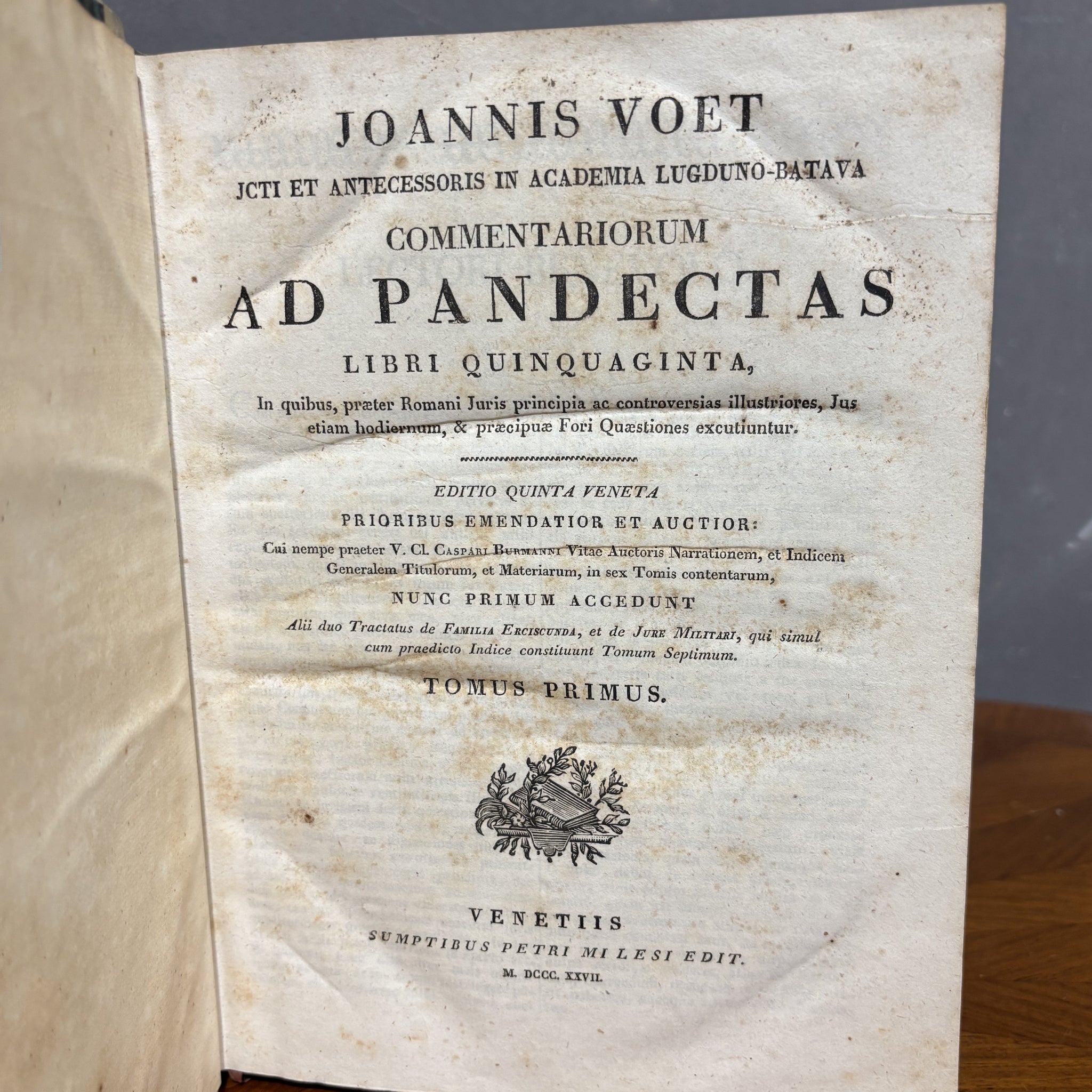 Importante edizione dei "Commentarium ad Pandectas Libri Quinquaginta" di Joannis Voet del 1827 che illustra uno studio del diritto romano e del diritto civile, ed è ancora oggi considerata una risorsa insostituibile per la comprensione delle Pandette di Giustiniano.