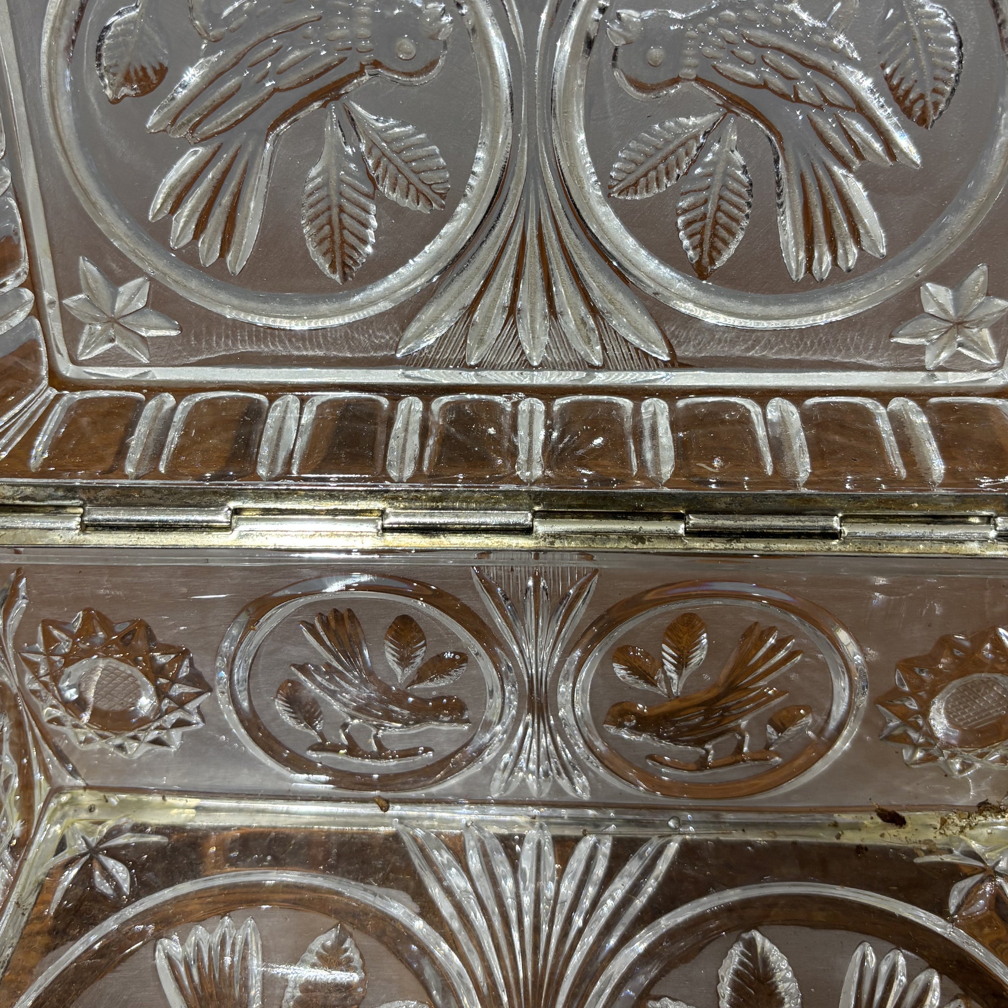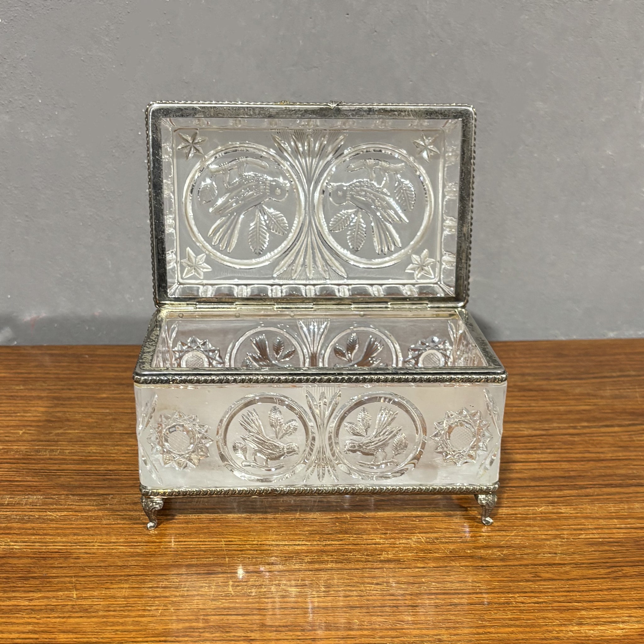 Ancient and elegant jewelry box in frosted and engraved glass with floral details and silver-plated metal profiles.