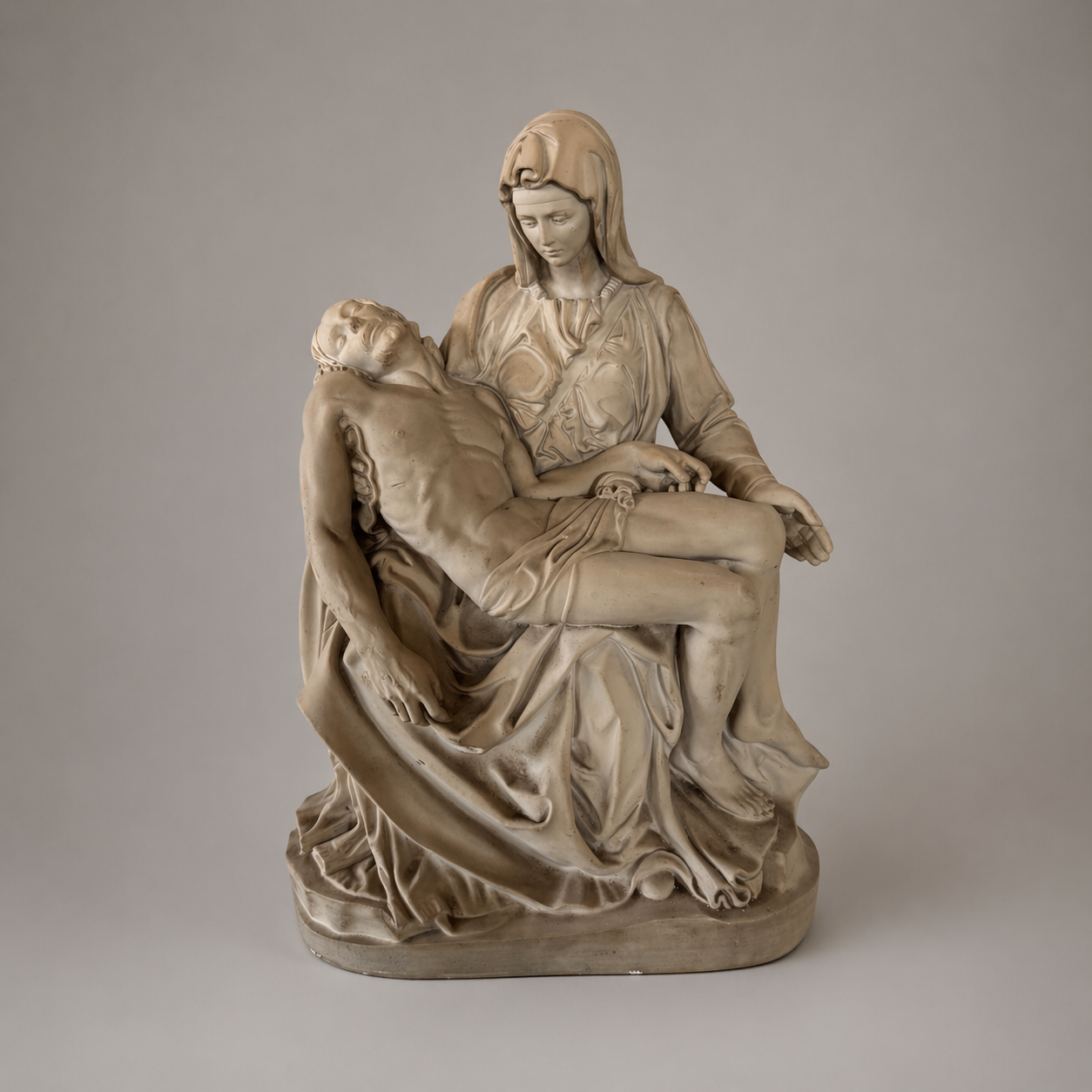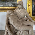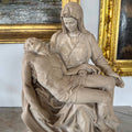 Raffinata scultura in marmo raffigurante la Pietà, ispirata al celebre capolavoro di Michelangelo conservato nella Basilica di San Pietro in Vaticano.