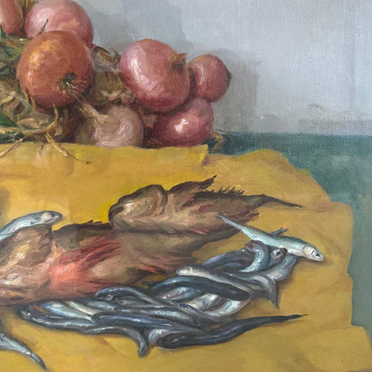 In primo piano, su una tovaglia dai toni caldi e luminosi, sono disposti con naturalezza uno scorfano e un gruppo di alici, resi con pennellate vive e materiche che restituiscono freschezza e realismo. Sullo sfondo, una composizione di frutta – dominata da melograni dai colori intensi – crea un raffinato contrasto cromatico, bilanciando la scena con toni più morbidi e atmosferici.