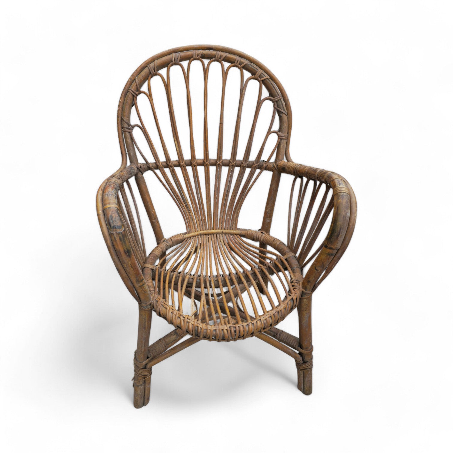 Complete set consisting of a sofa, two armchairs and a coffee table, in curved bamboo and wicker, dating back to the 1960s.