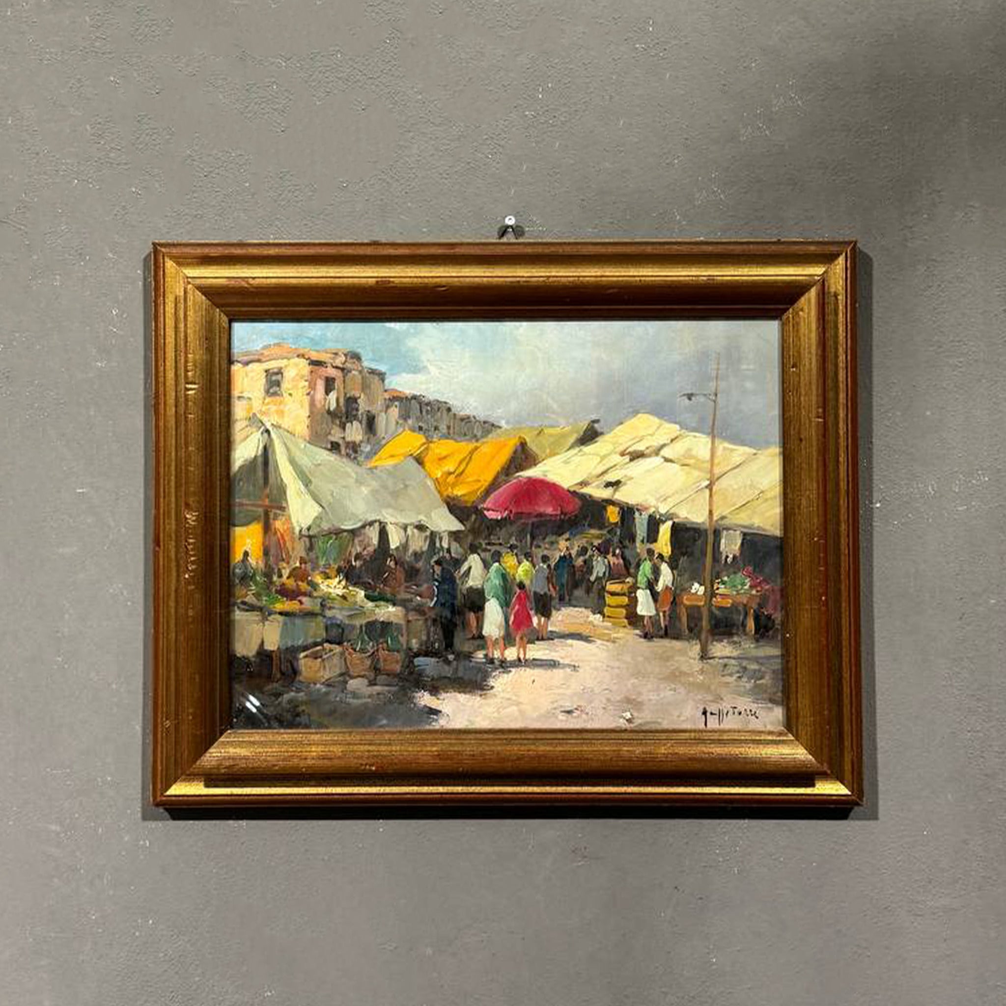 La pennellata è sciolta, sicura e materica, capace di restituire con naturalezza l’atmosfera brulicante del mercato, privilegiando luce e ritmo rispetto al dettaglio descrittivo. Le figure, accennate con pochi tocchi efficaci, trasmettono movimento e autenticità, mentre lo sfondo urbano, appena abbozzato, è visibile nell’angolo superiore sinistro della composizione.