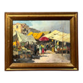 Olio su tela raffigurante una movimentata scena di mercato popolare, animata da numerose figure e da una raffinata orchestrazione di colori caldi e luminosi. Le bancarelle, coperte da ampi tendoni chiari e l’ombrello rosso posto al centro della composizione, sono gli elementi focali che catturano immediatamente lo sguardo e accompagnano l’osservatore lungo la prospettiva centrale della scena.