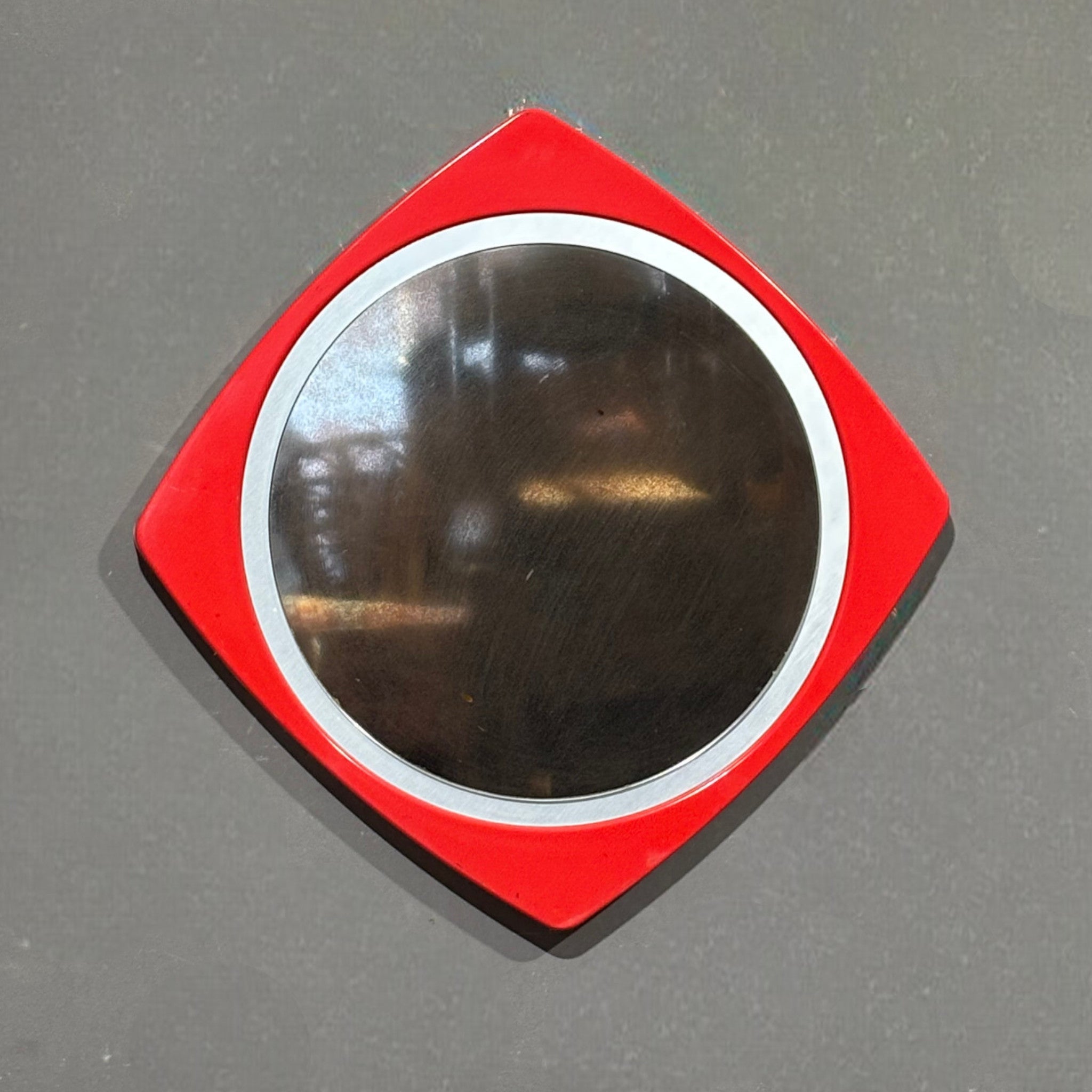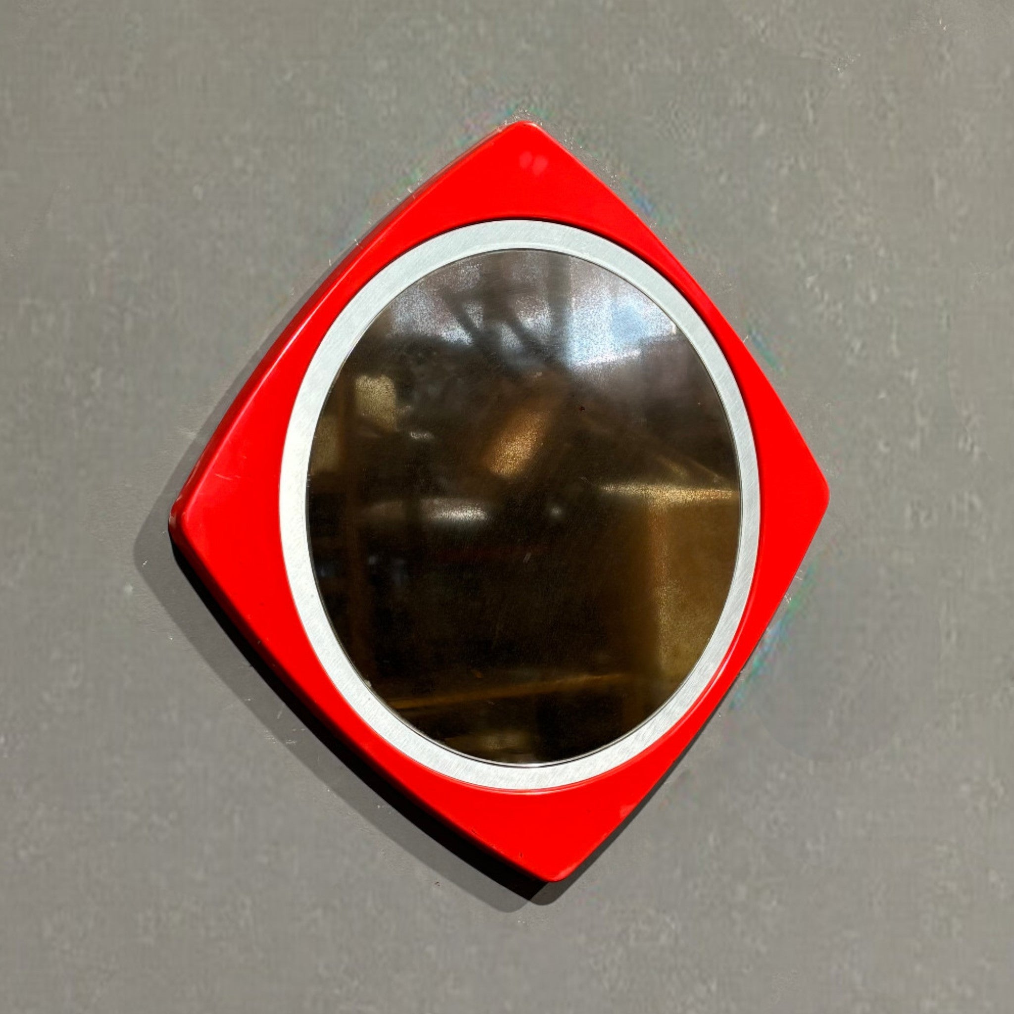 Particular vintage 1970s Space Age mirror with patinated mirror and red plastic frame. The Thema mirror, Made in Italy, is in excellent condition as shown in the photos.
