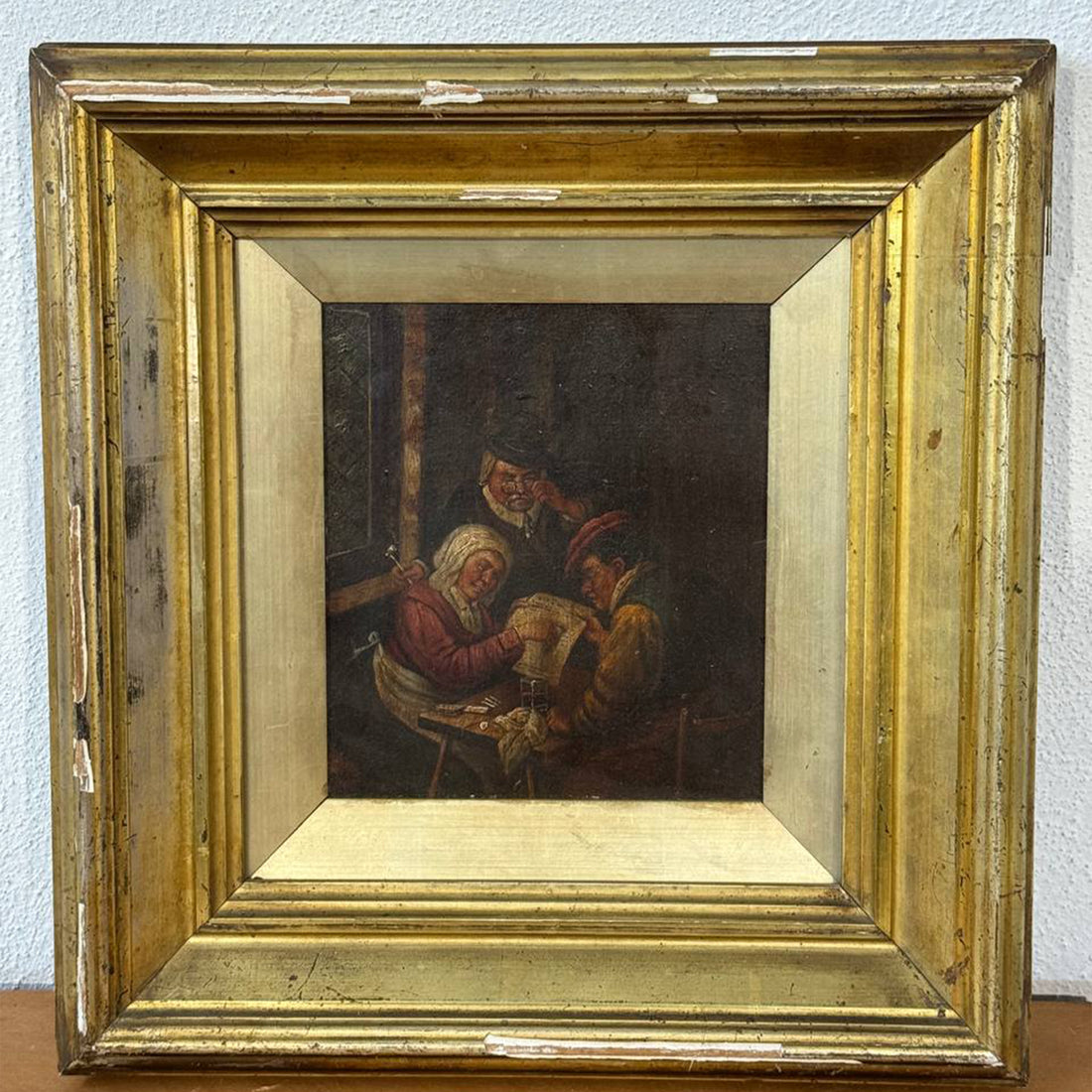 Dipinto ad olio su tavola di gusto antico, raffigurante una vivace scena d’interno con figure...