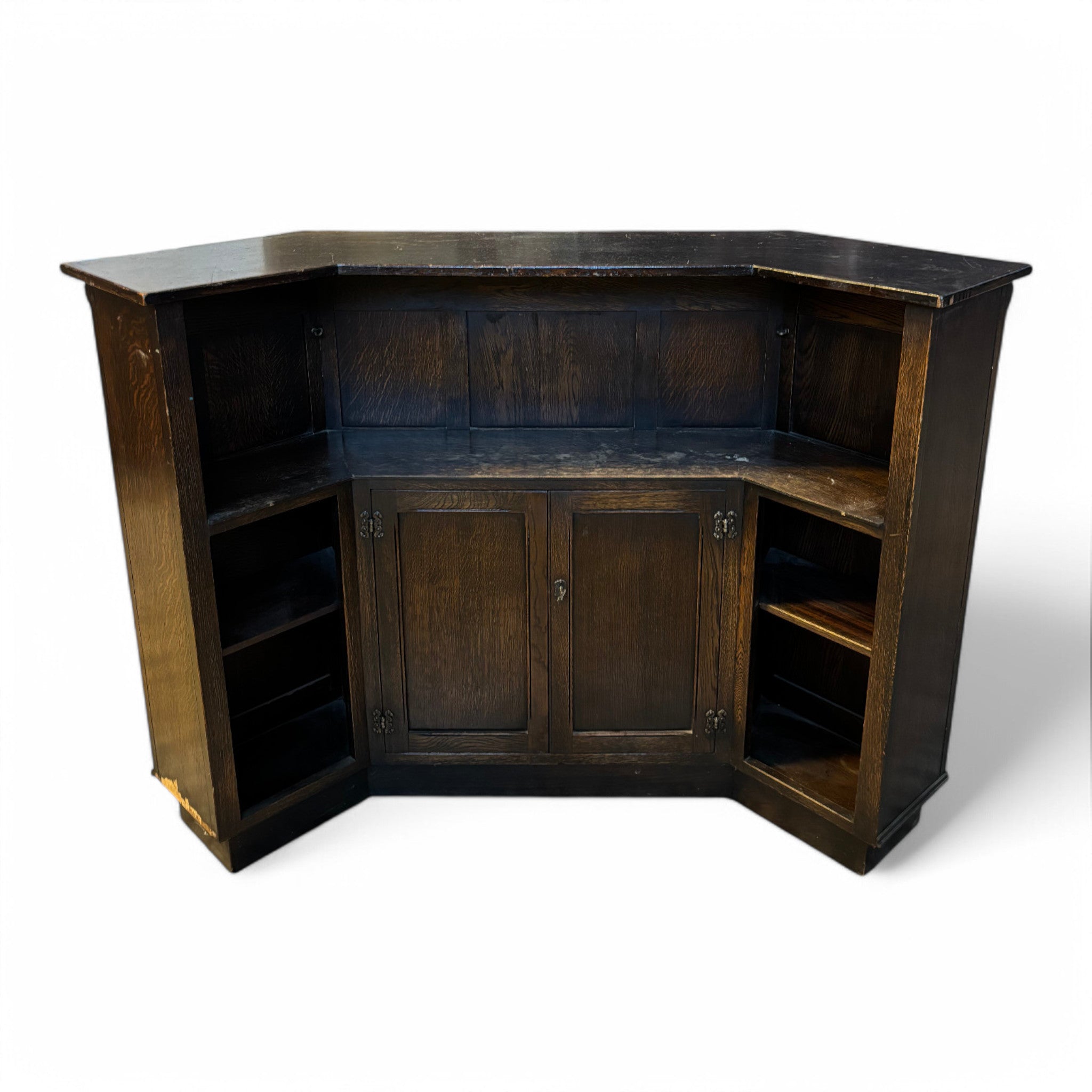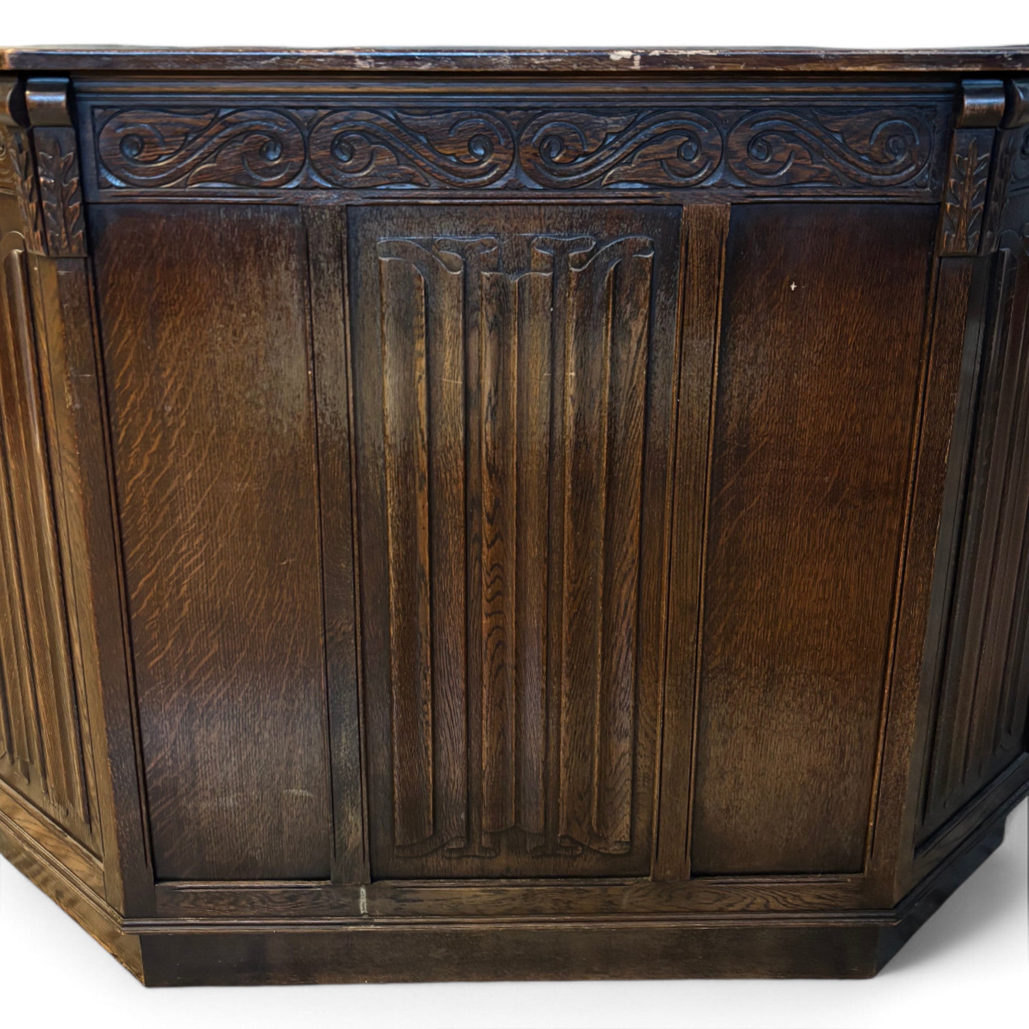 Bellissimo mobile bar in rovere massello, di forma semiesagonale con il lato frontale più lungo e due laterali a chiuderne la linea.