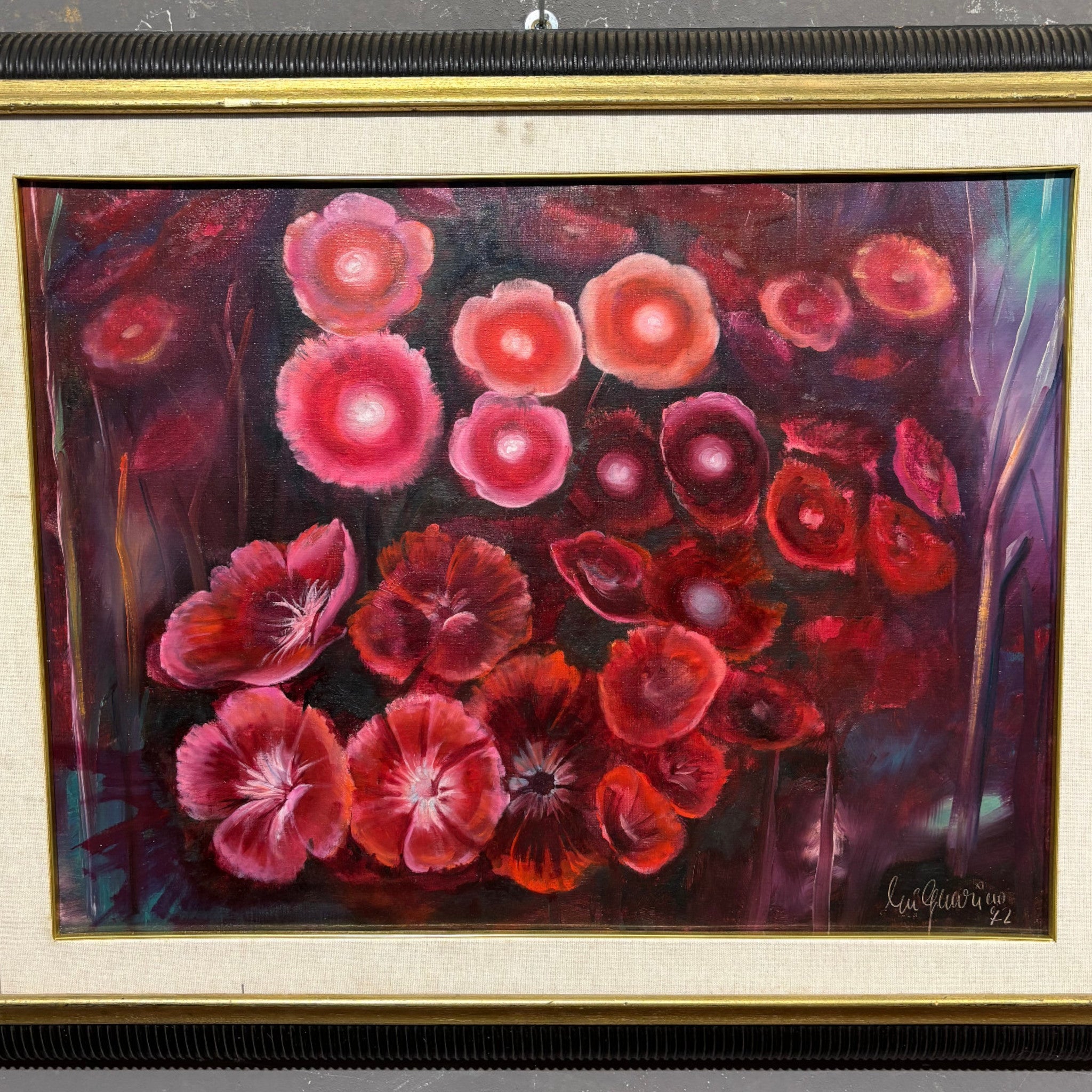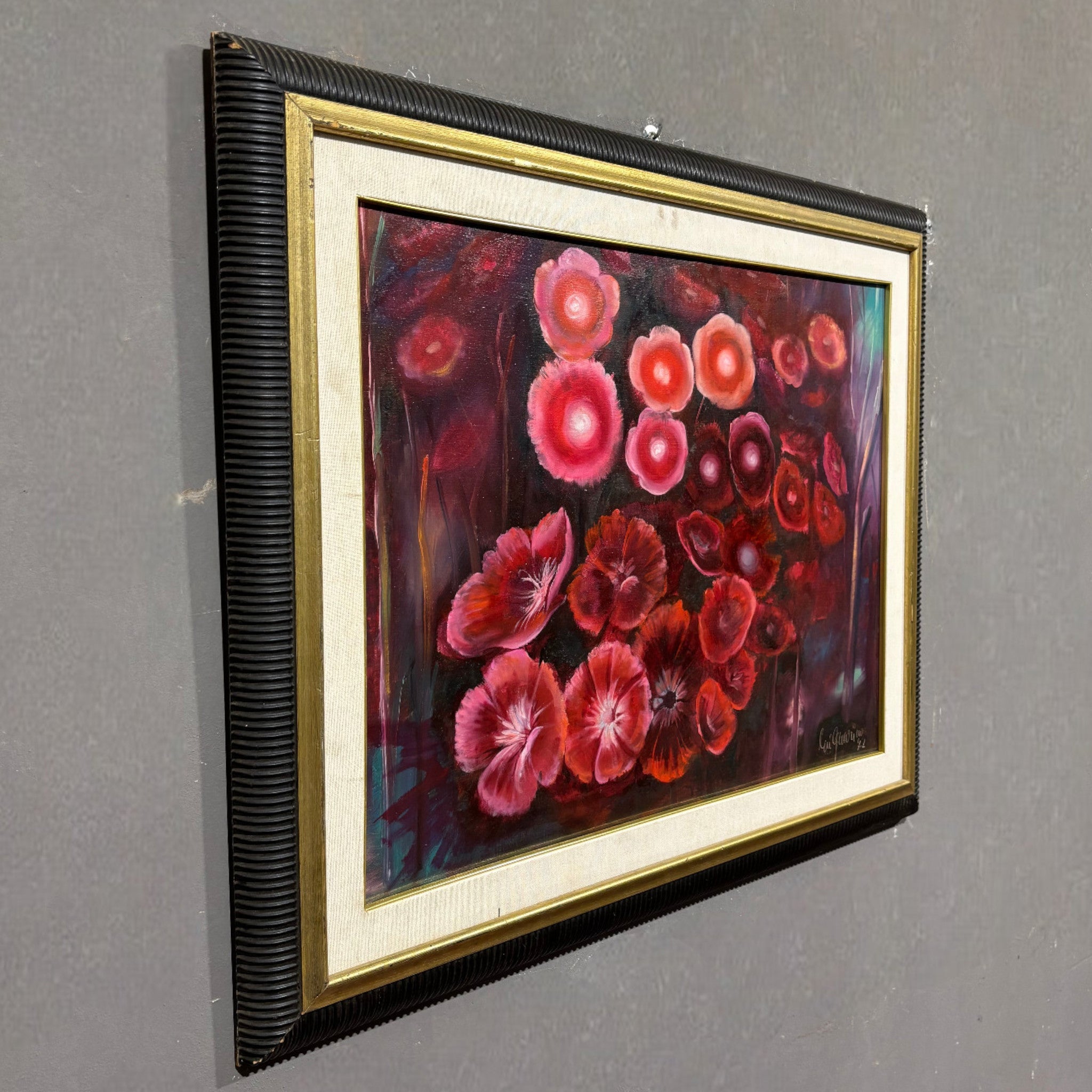 Meraviglioso dipinto ad olio su tela raffigurante splendidi fiori nelle tonalità del rosso.