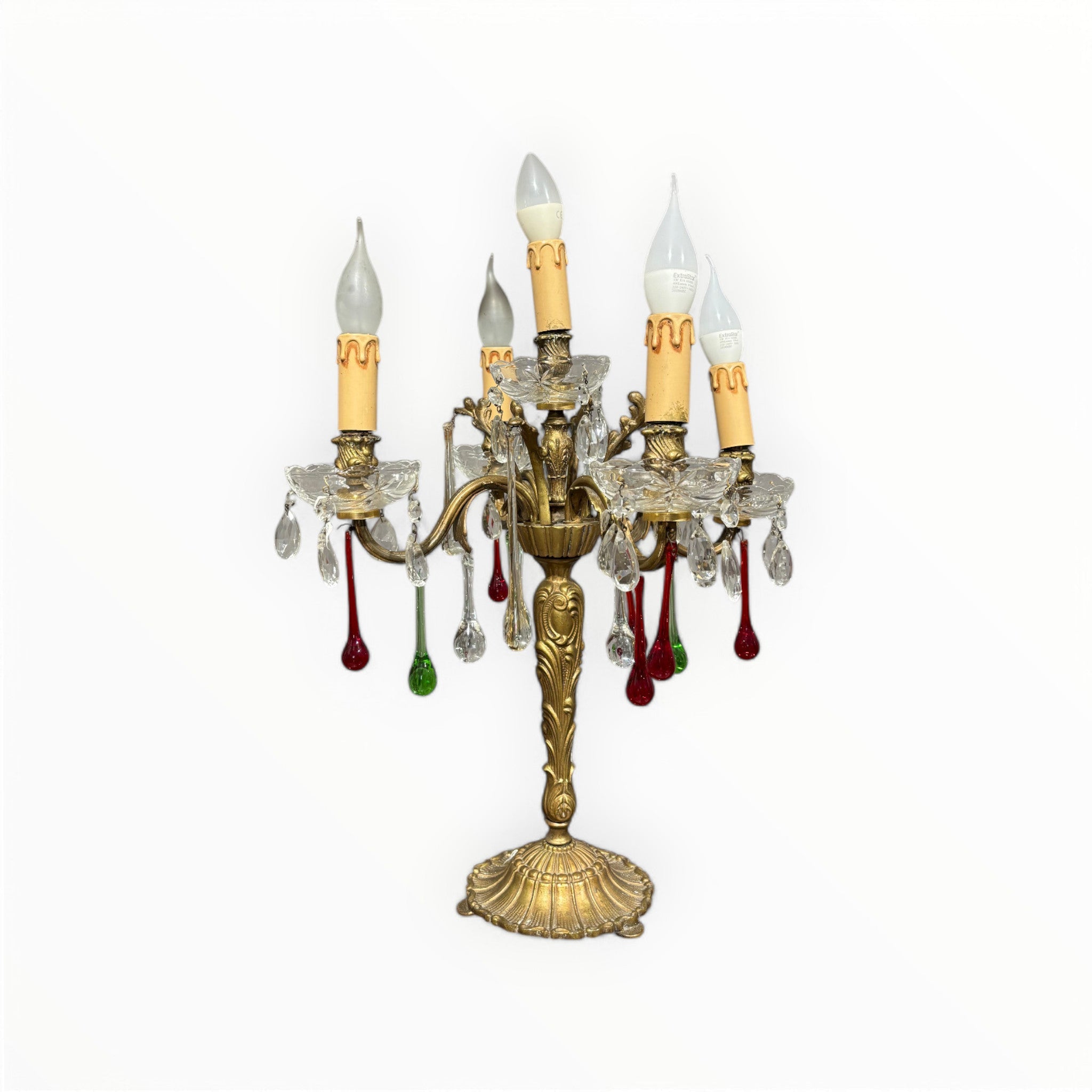 Élégante lampe de table Girandole, ornée de volutes de feuilles et de fleurs et enrichie de pendentifs en verre de Murano vert et rouge. Datant du 20e siècle.