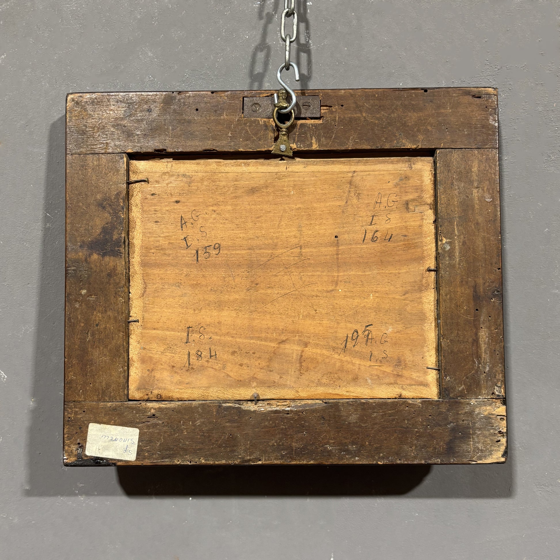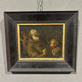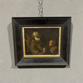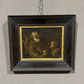 Il dipinto è impreziosito da una cornice d’epoca, con finitura scura e raffinati dettagli dorati, perfettamente coerente con il periodo e capace di esaltare la scena.