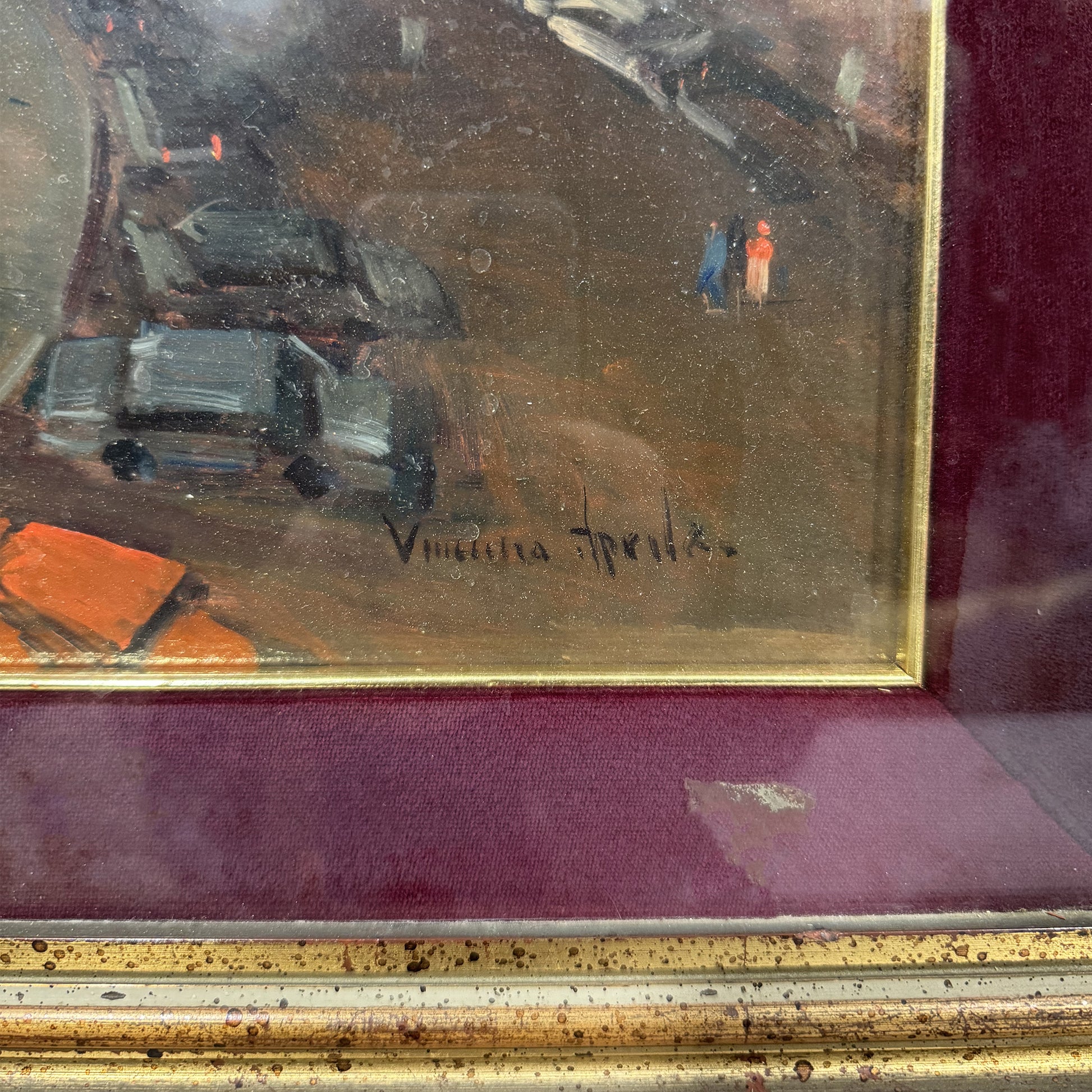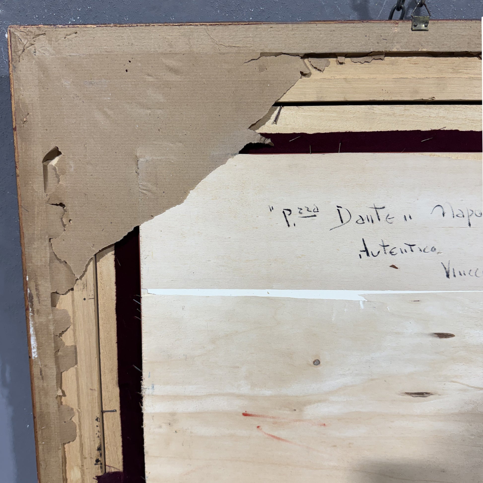 Elegante olio su tavola di Vincenzo Aprile, raffinato esponente della scuola paesaggistica napoletana, che raffigura un’ampia veduta di Piazza Dante a Napoli colta da un punto di osservazione rialzato.