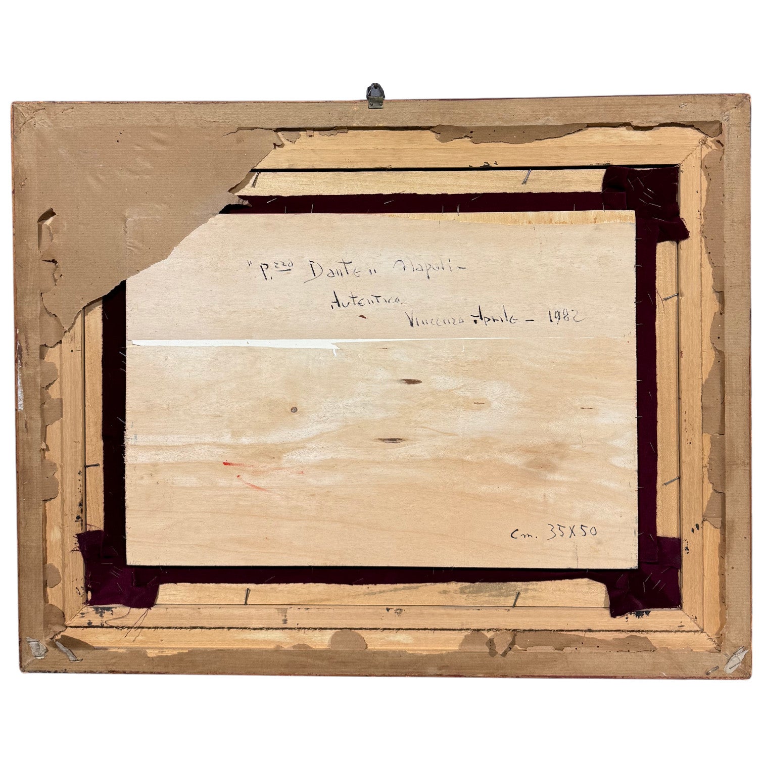 La tavola presenta un’ampia veduta da un punto di vista rialzato della piazza dove sono visibili tutti i dettagli: le facciate dei palazzi, i giardini, le cupole delle chiese, e soprattutto il celebre monumento dedicato al poeta Dante Alighieri, ancora oggi al centro della piazza. L’opera è chiaramente di gusto impressionista: le pennellate veloci, materiche ed immediate, unite ad uno stile facilmente riconoscibile, restituiscono un’immagine vibrante e movimentata della Napoli di fine anni ’80.