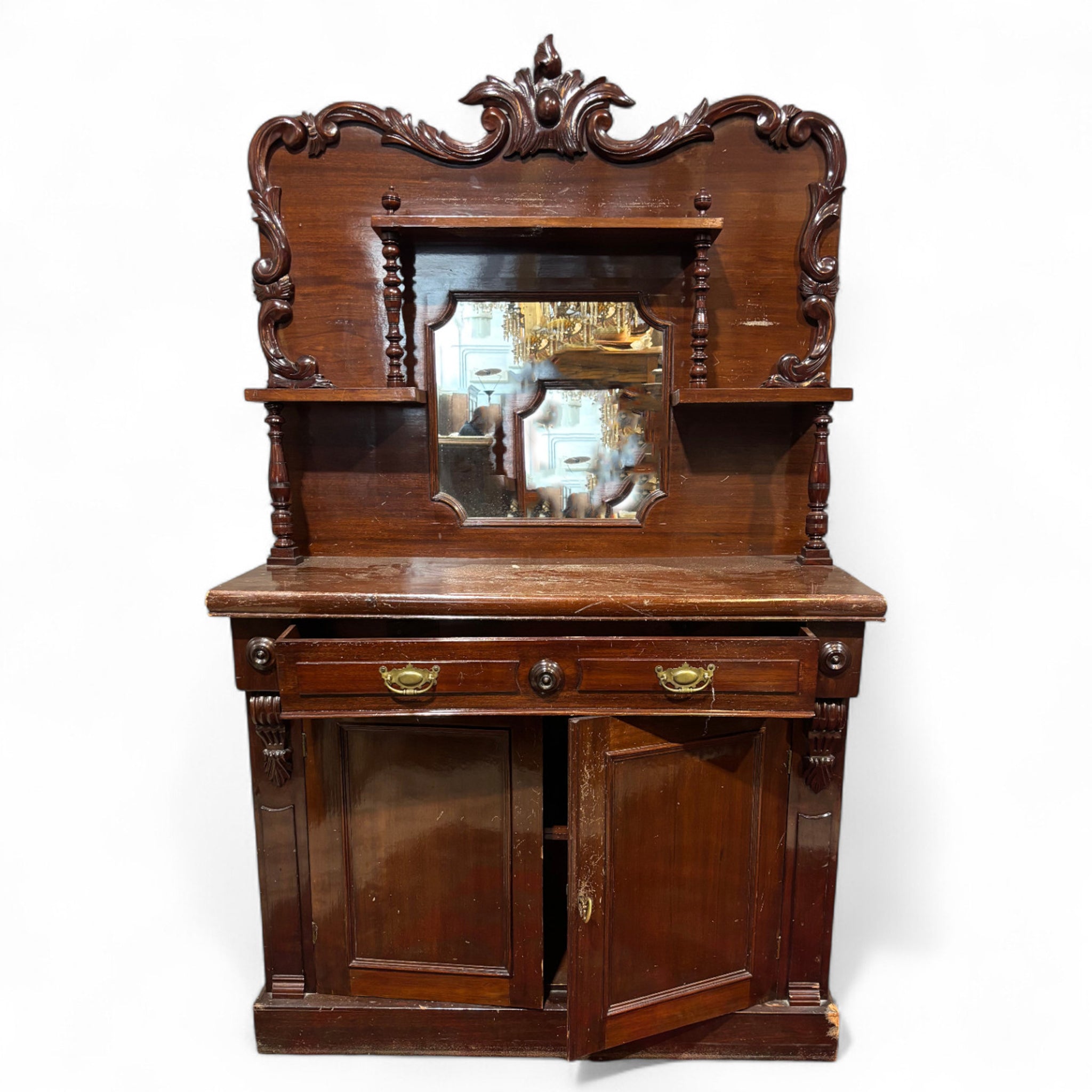 Graziosa Servant a due ante Vittoriana in mogano caratterizzata dalla sua alzata originale con specchio e ripiani.