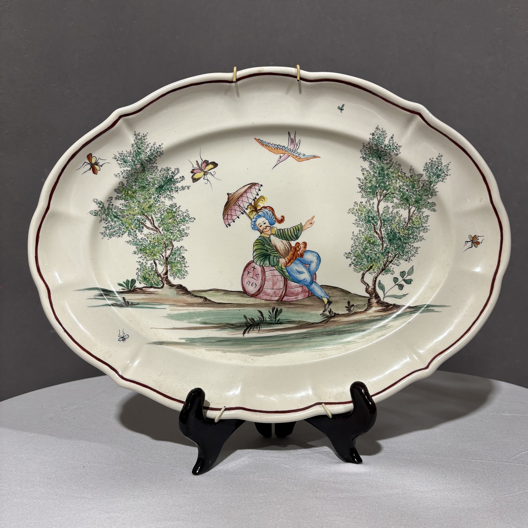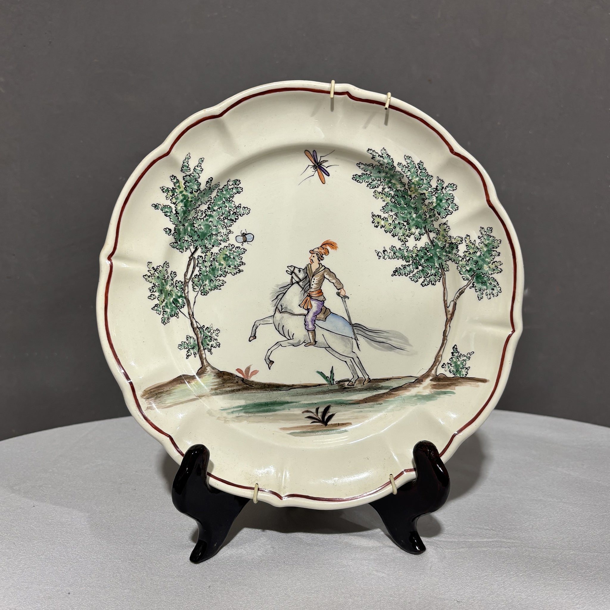 Ogni piatto è delicatamente dipinto a mano con affascinanti scene galanti in stile settecentesco, raffiguranti figure in paesaggi bucolici con dettagli curati a colori vivaci.