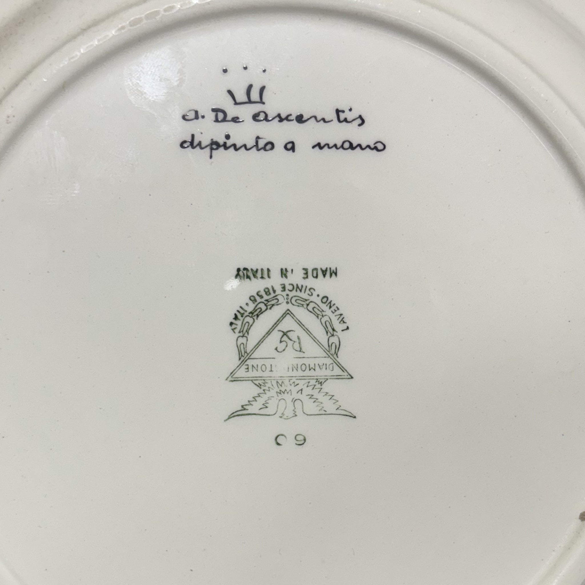 Il retro di ogni piatto reca il marchio "Diamond Stone Laveno" e la firma A.De Ascentis Dipinto a mano