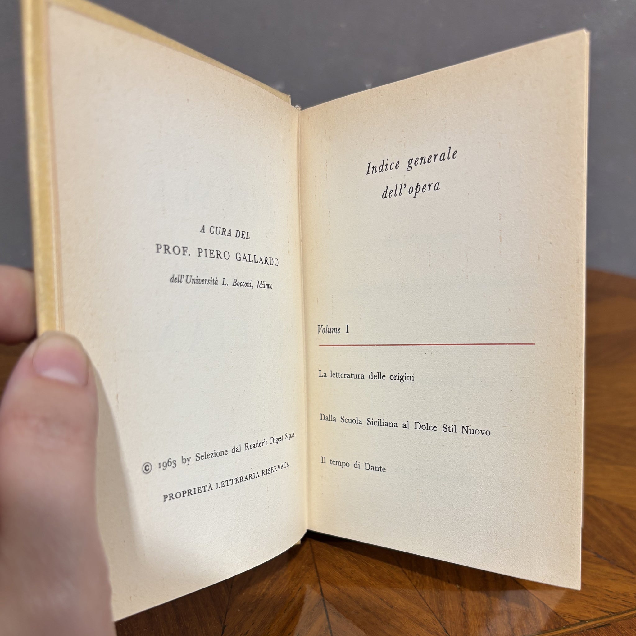 Pubblicata a Milano nel 1963 dalla selezione dal Reader's digest, questa antologia di sei volumi, rappresenta una testimonianza della cultura e della lingua italiana di metà Novecento.