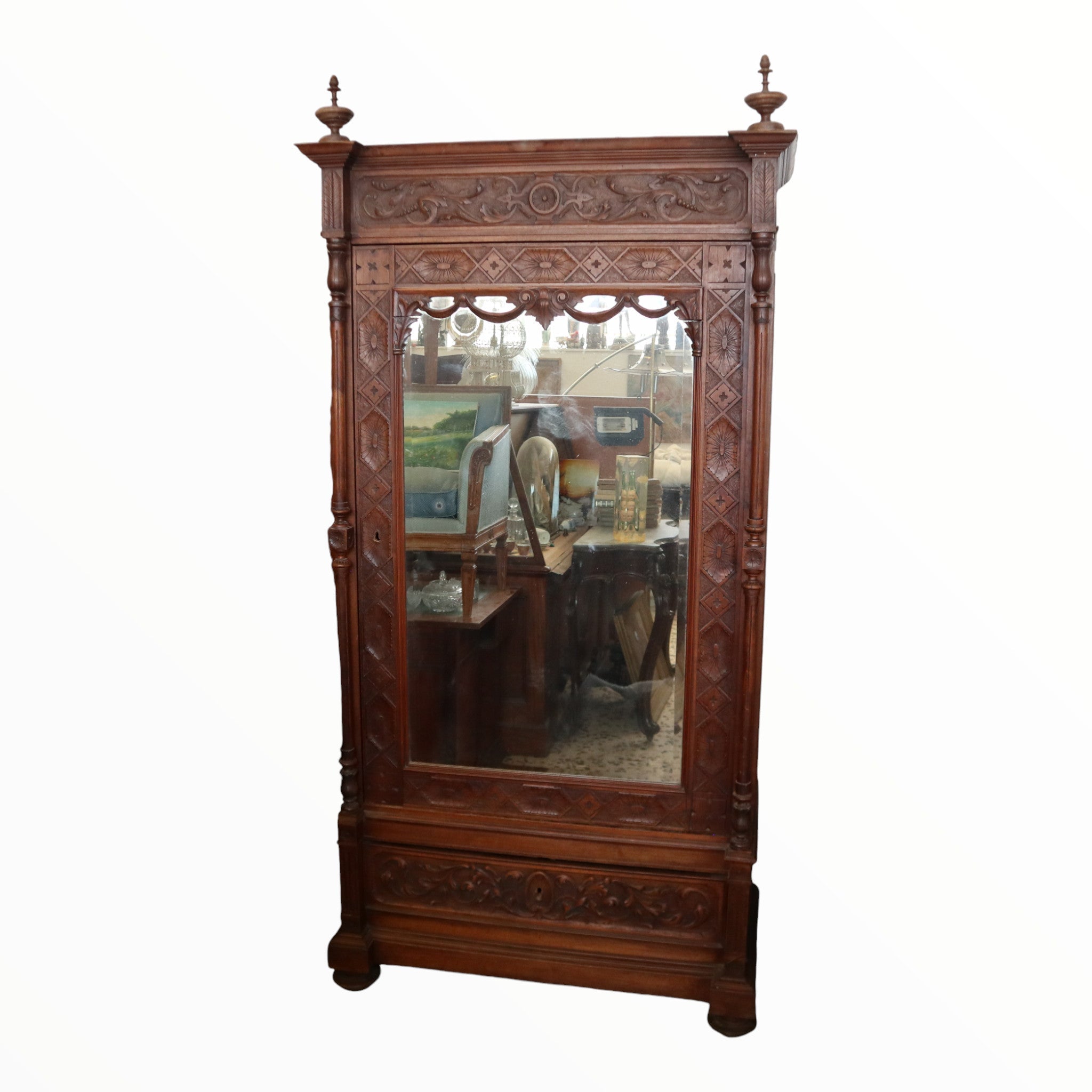 lateralmente reca due colonne tornite e intagliate, e nella parte alta due pinnacoli torniti, sulla specchiera è possibile osservare una finissima ghirlanda in legno intagliato.