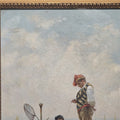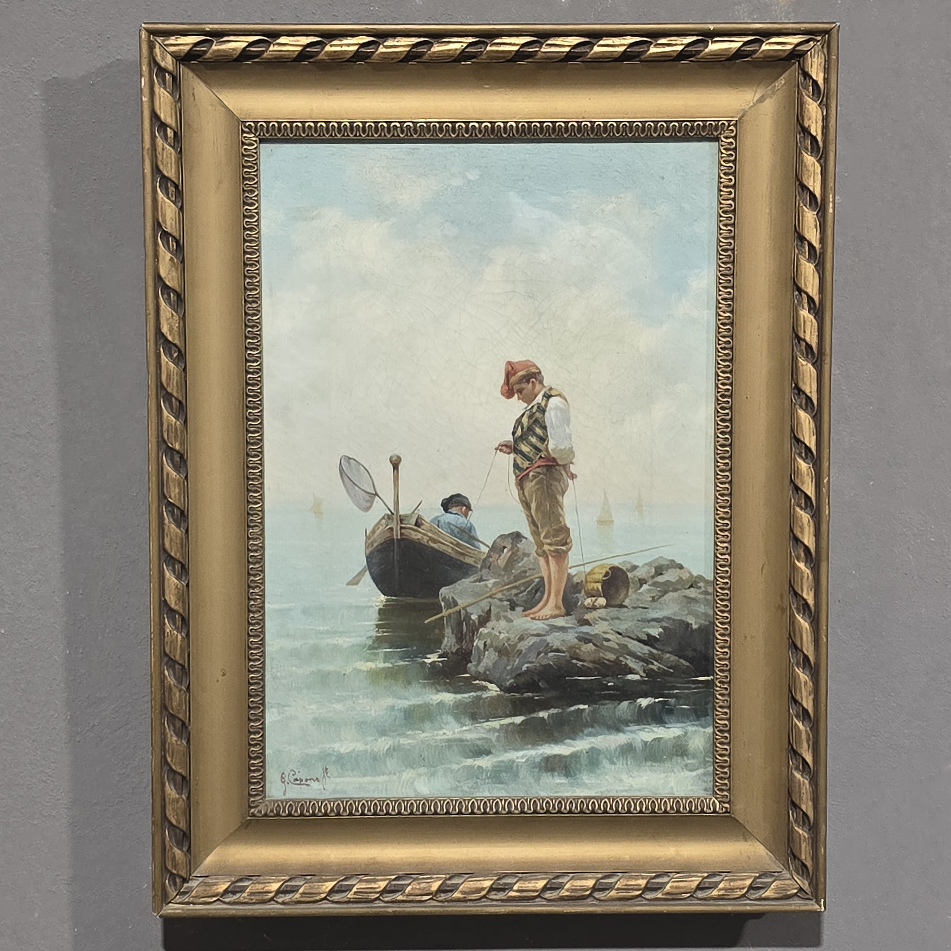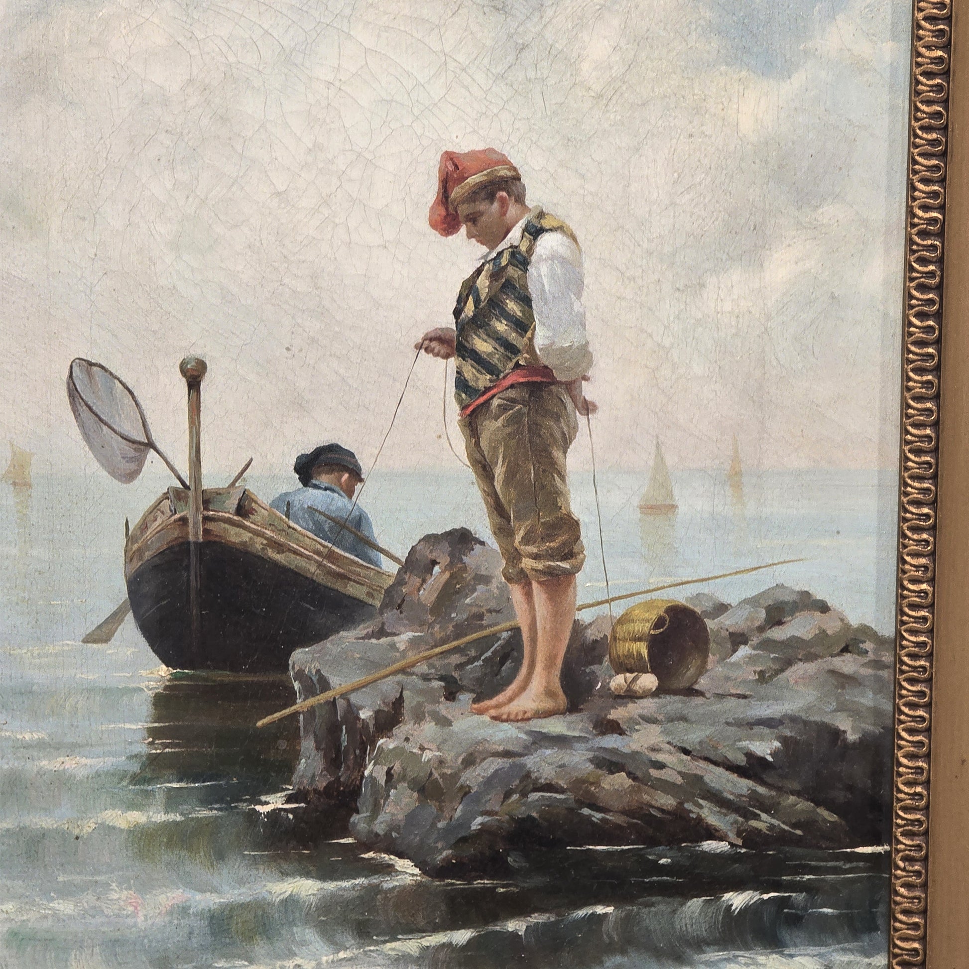 Scena marina di straordinaria sensibilità luministica, in cui un giovane pescatore in abiti popolari è raffigurato sull’orlo di uno scoglio intento nella pesca. Sullo sfondo, una barca e vele lontane definiscono un’atmosfera serena e limpida tipica della pittura di genere napoletana di fine Ottocento.