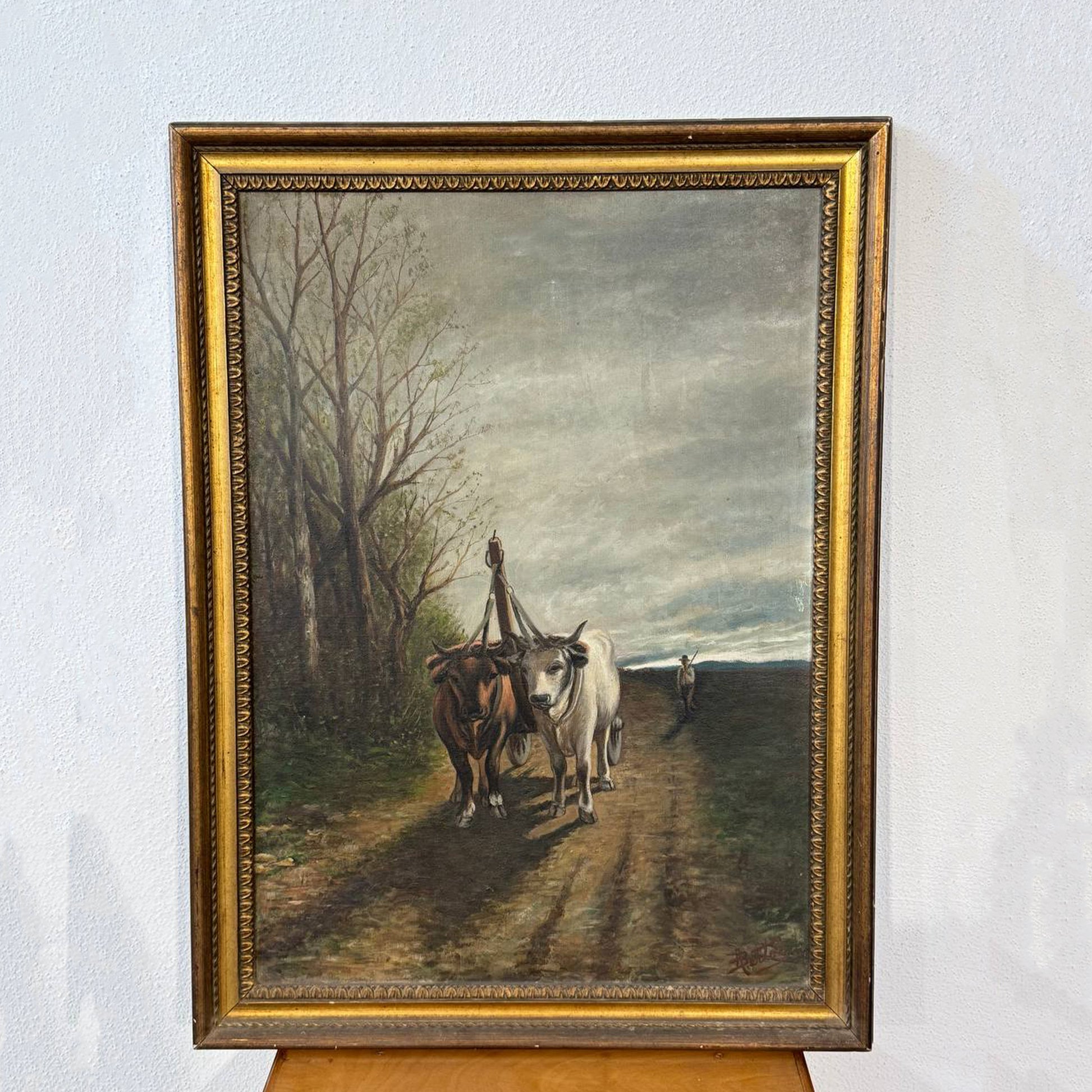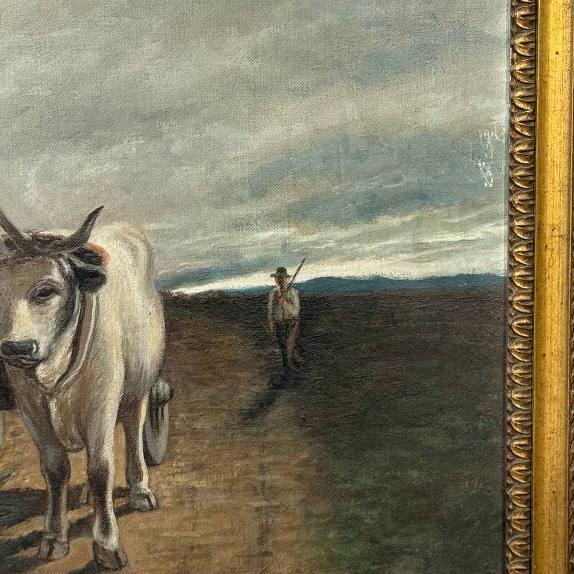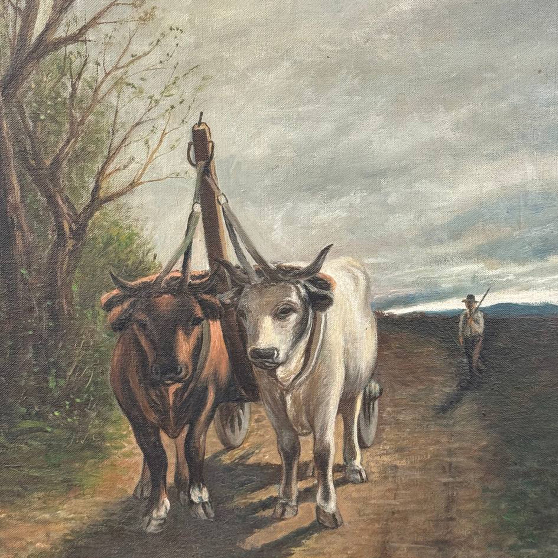 Suggestivo dipinto a olio su tela che raffigura una scena di vita contadina: due buoi al traino avanzano lentamente lungo un sentiero di campagna, accompagnati da un contadino sullo sfondo.