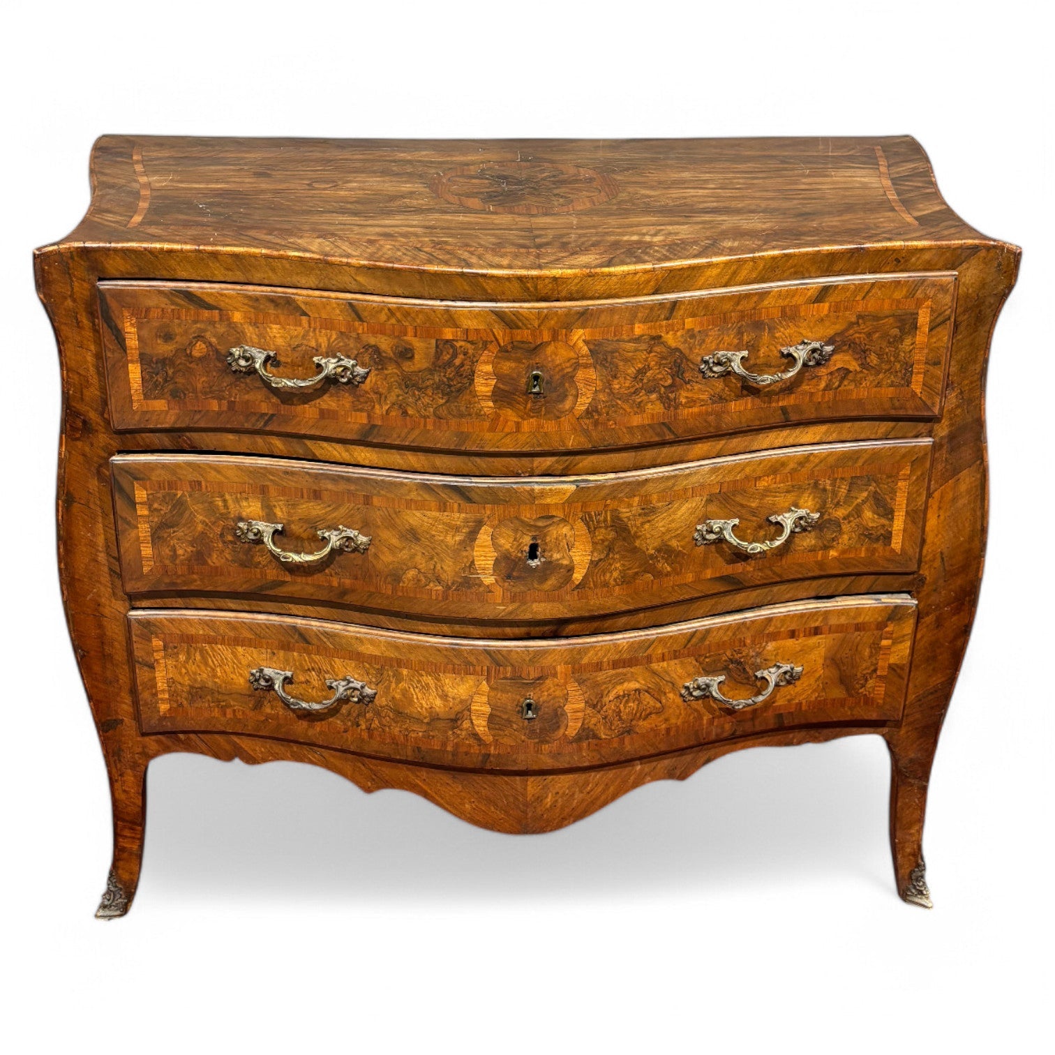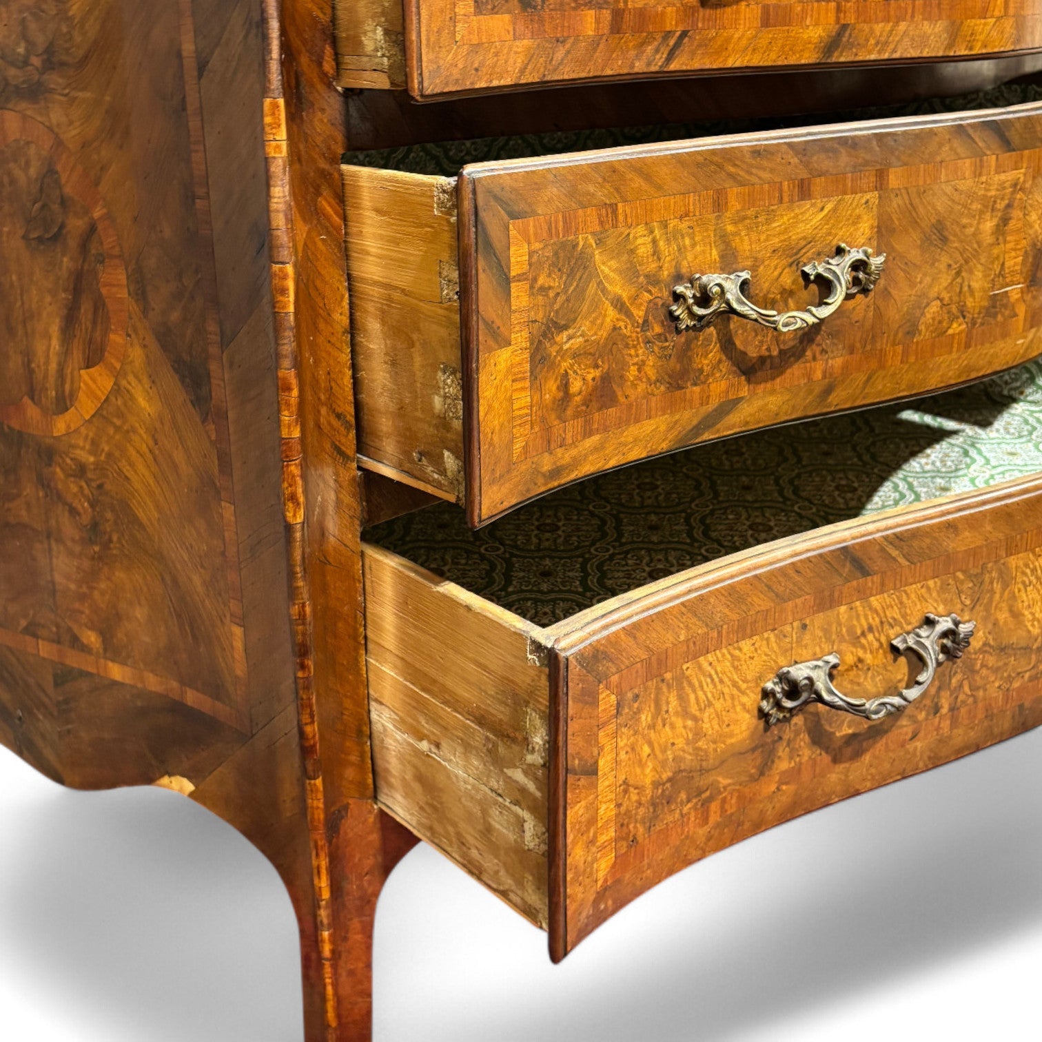Splendido ed Importante Cassettone Luigi XV Napoletano intarsiato in vari legni pregiati.