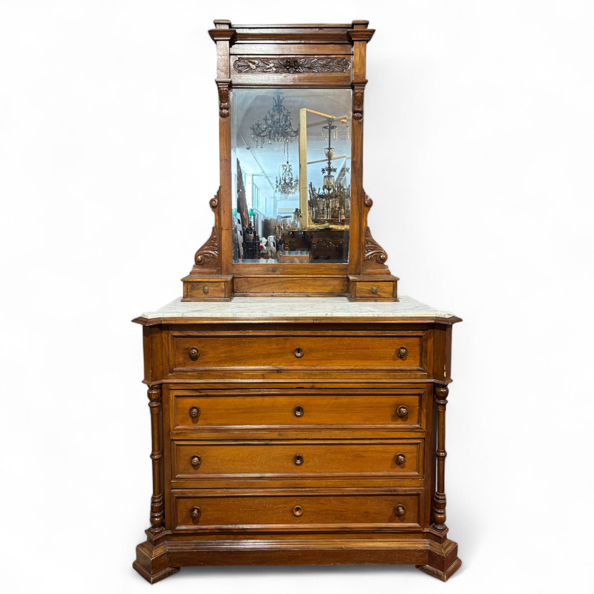 Cassettone Italiano con piano in marmo e quattro cassetti, interamente in legno intagliato a motivi classici del periodo Umbertino ( Fine XIX secolo ) e con colonnine laterali originali.