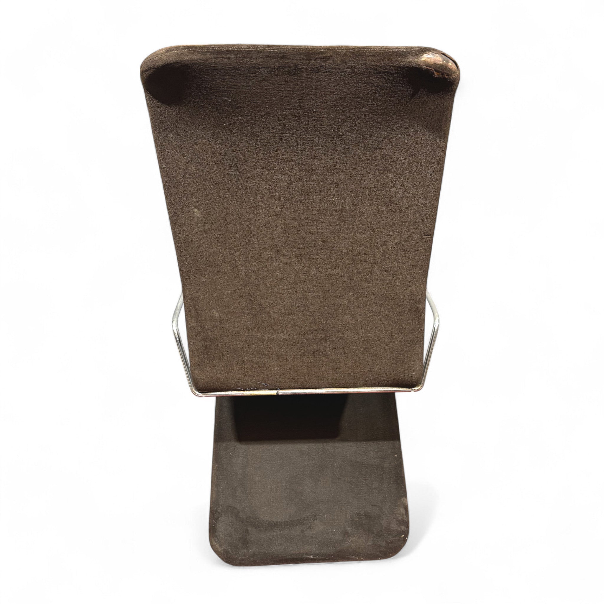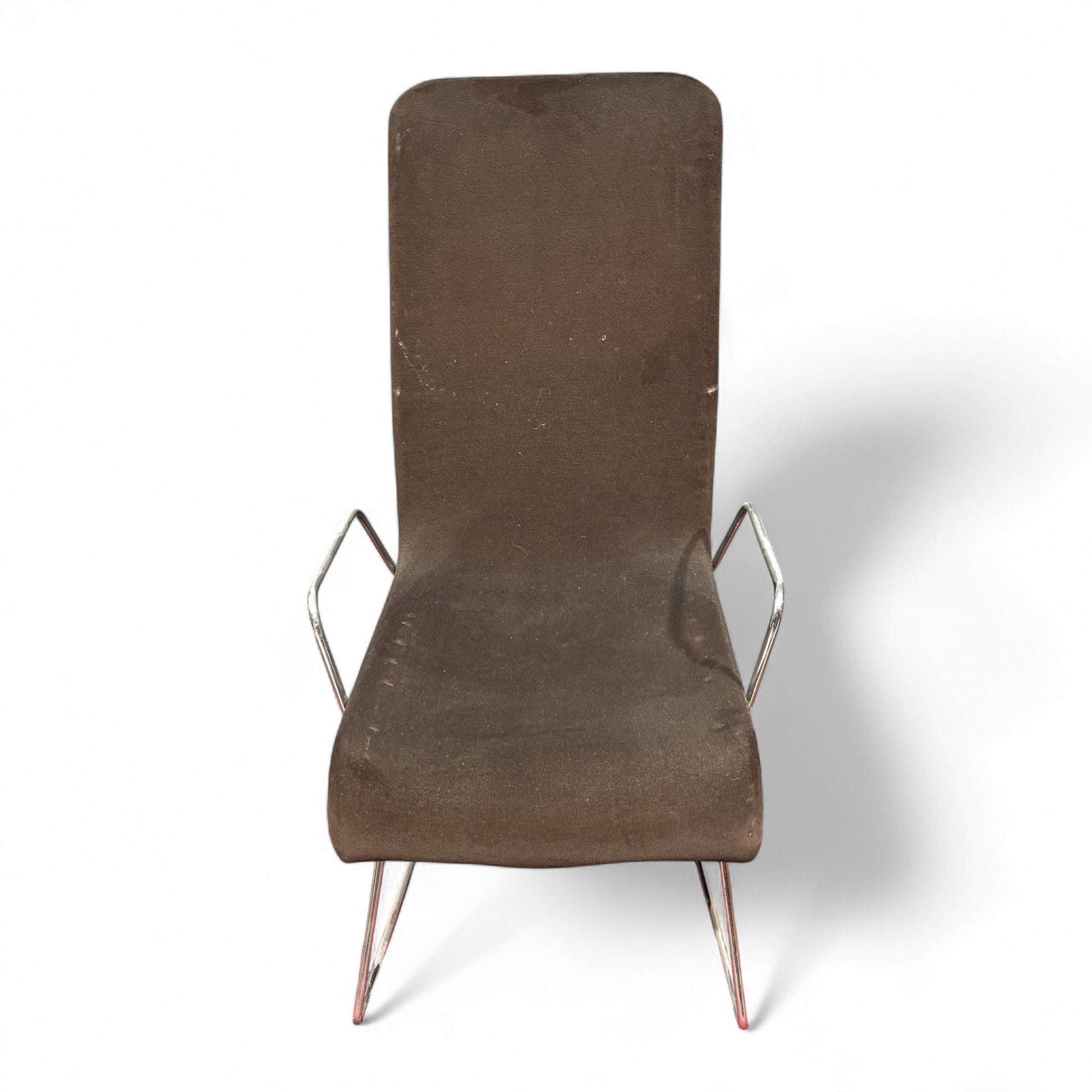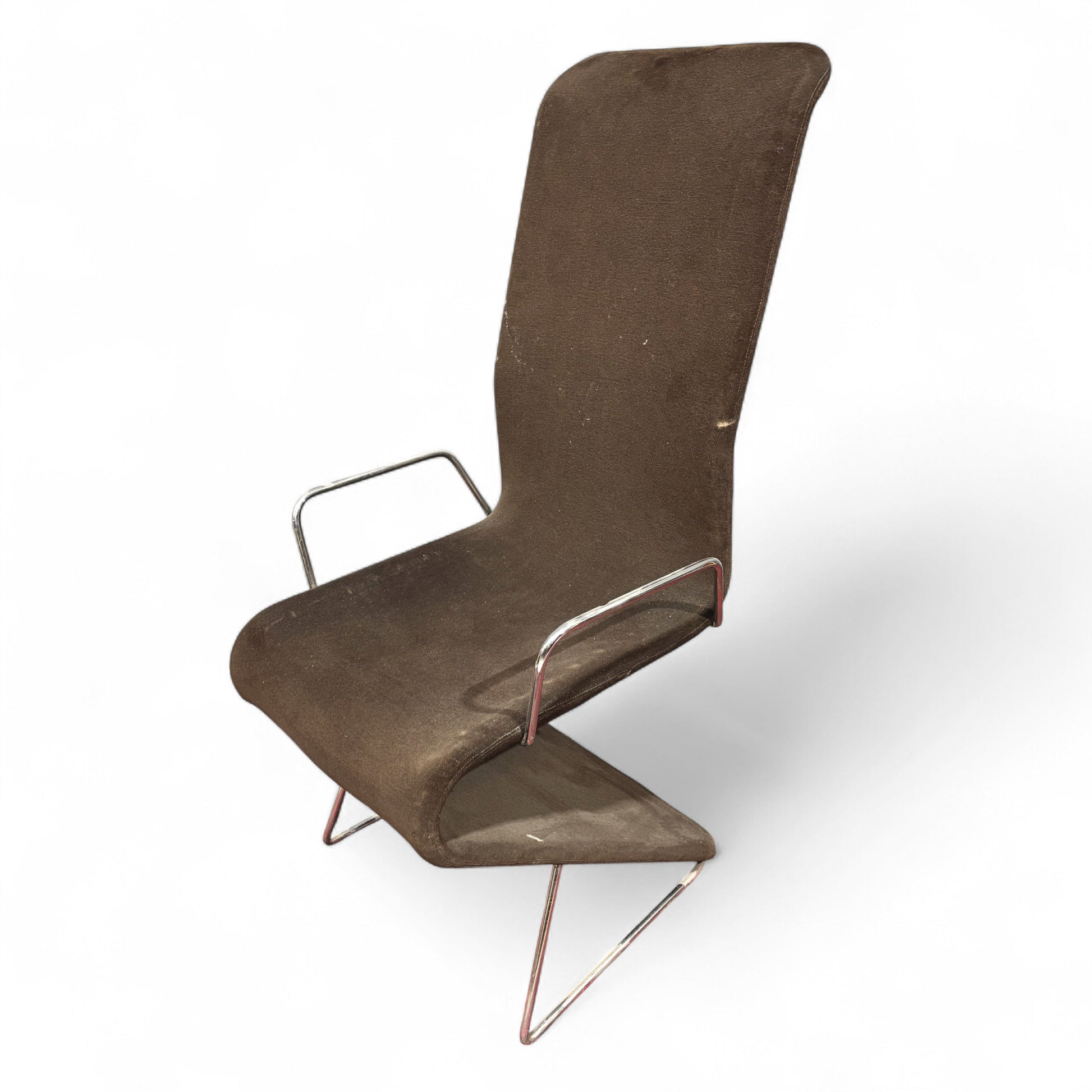 Questa sedia presenta un design "Space Age" tipico degli anni '70, caratterizzato da linee moderne e una forma distintivaLa struttura della sedia è in acciaio cromato, visibile nelle gambe e nei braccioli.