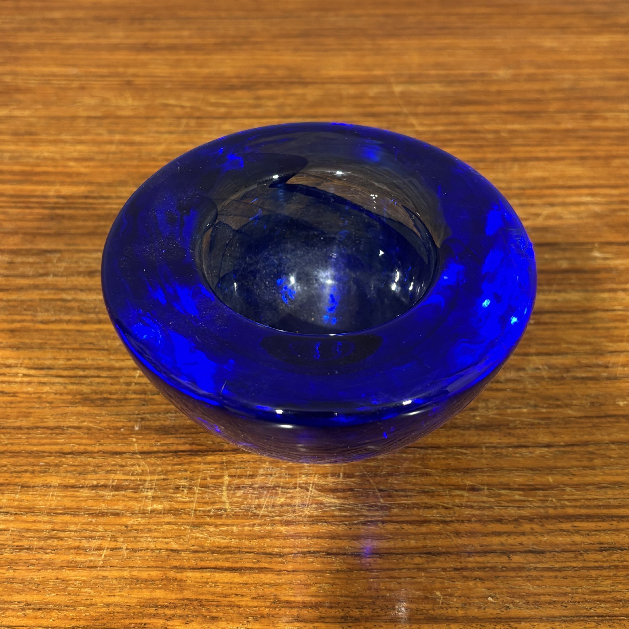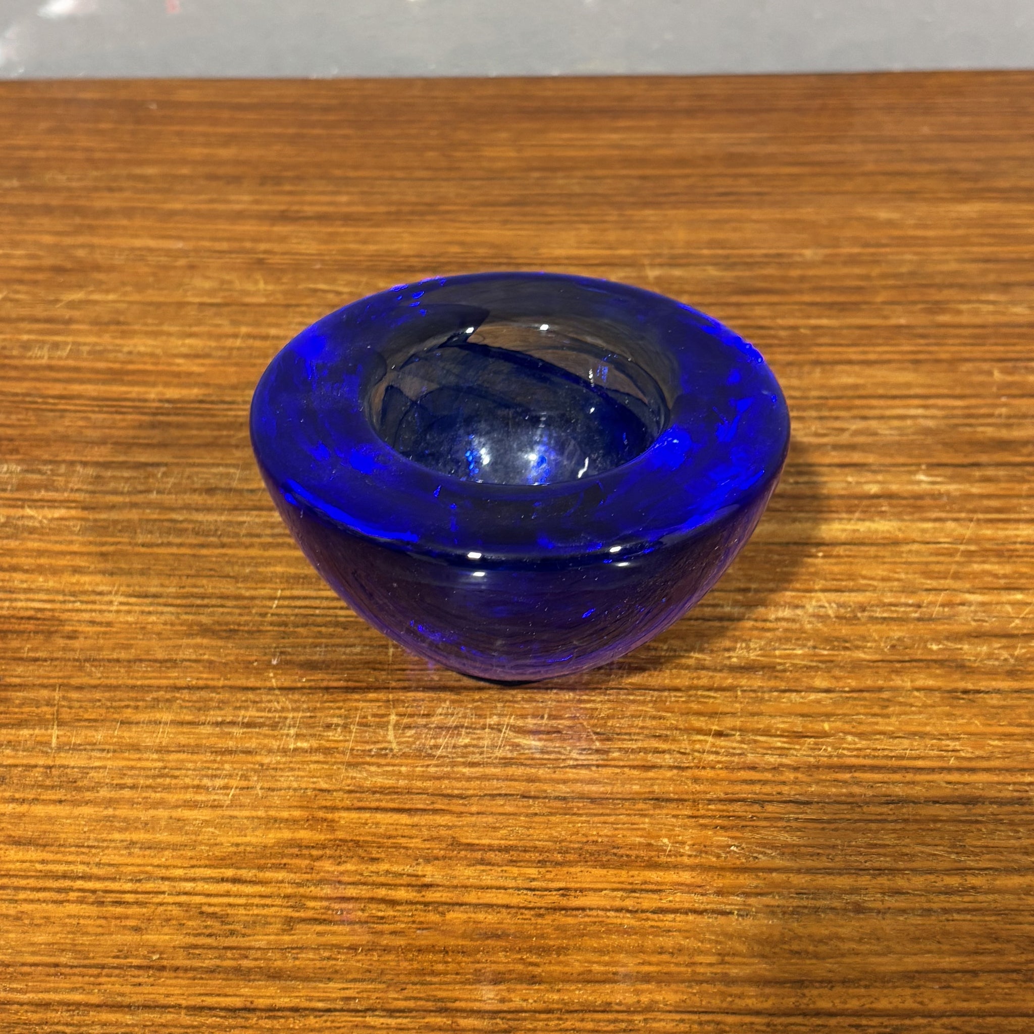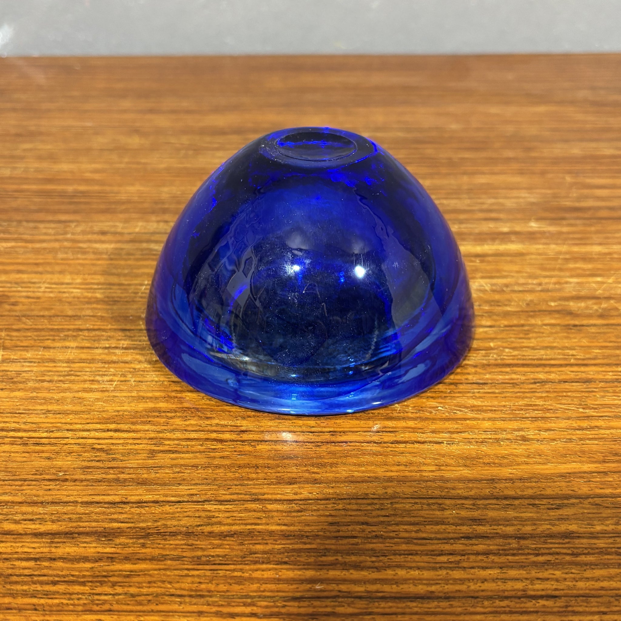 Atoll è un posacenere in cristallo blu realizzato con una lavorazione in vetro che crea effetti ottici che imitano un vortice.