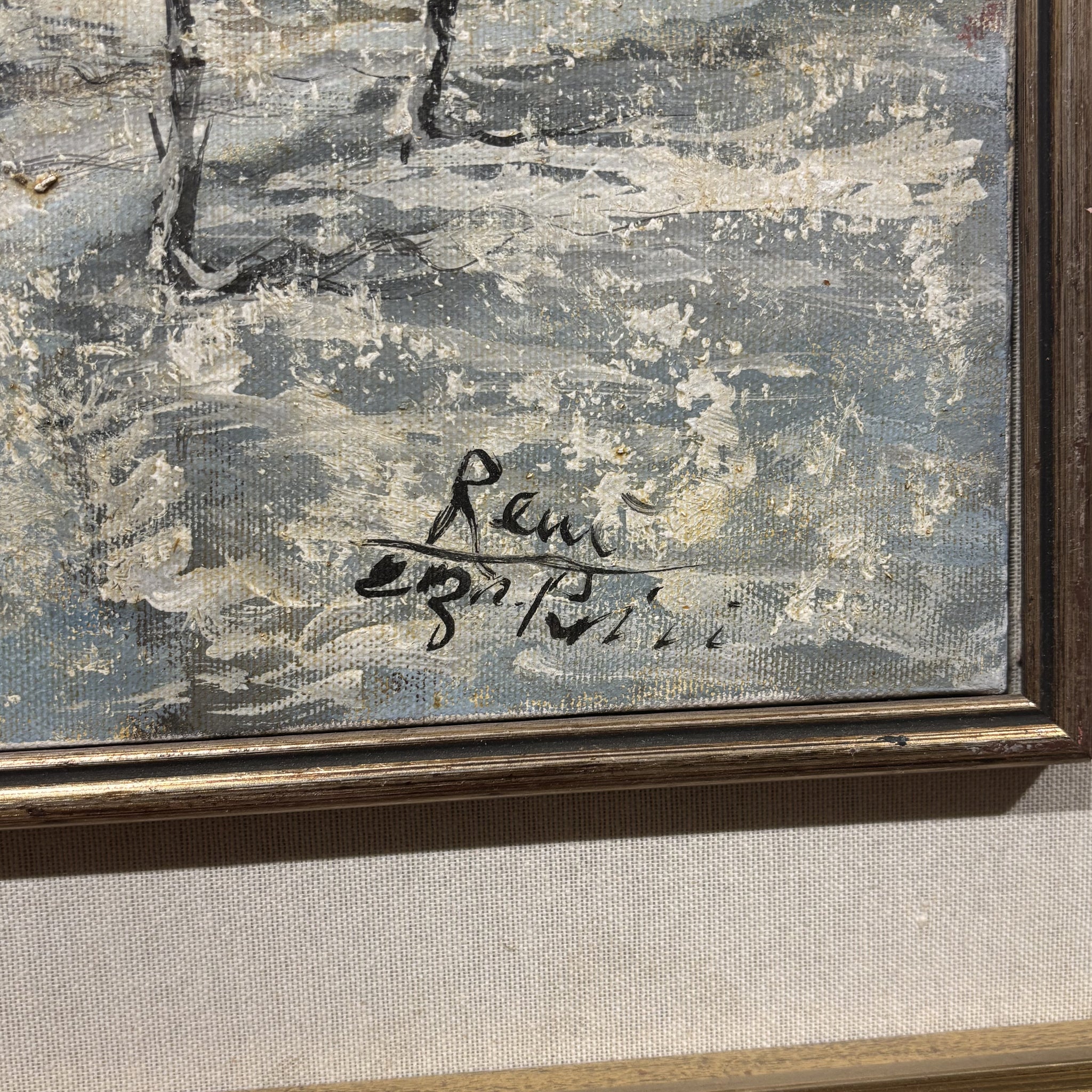 Dipinto ''nevicata'' ad olio su tela inserito in cornice in legno dorato originale.
