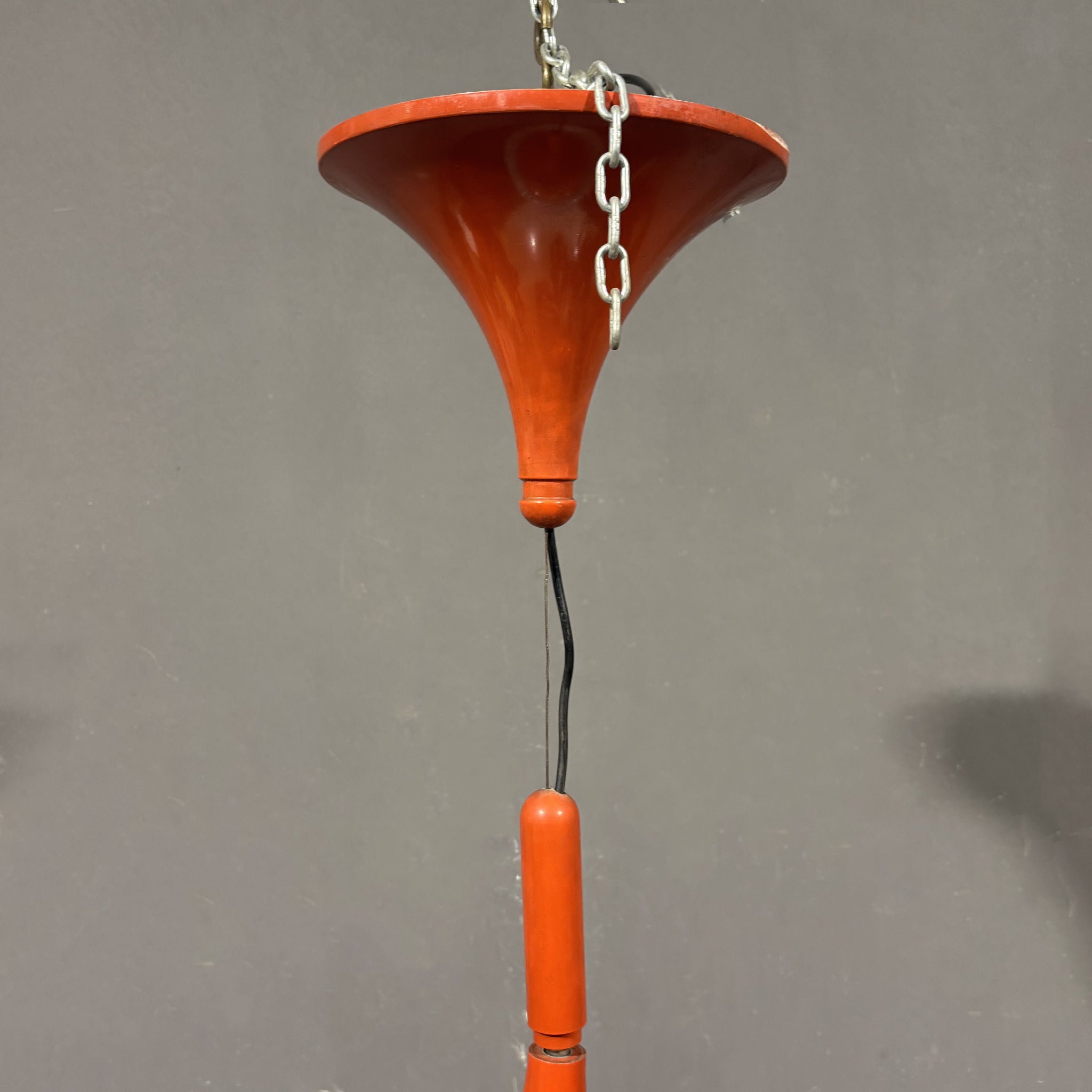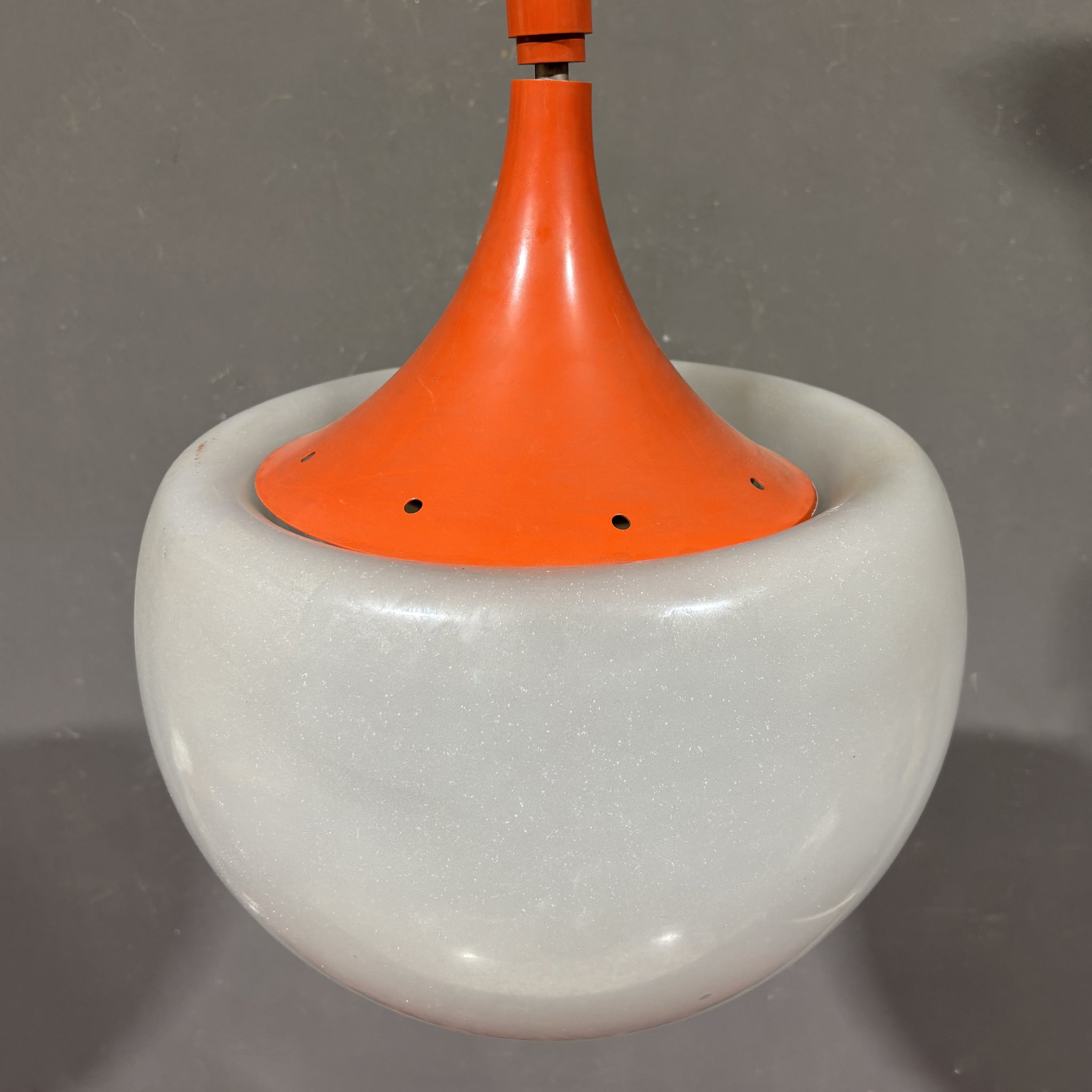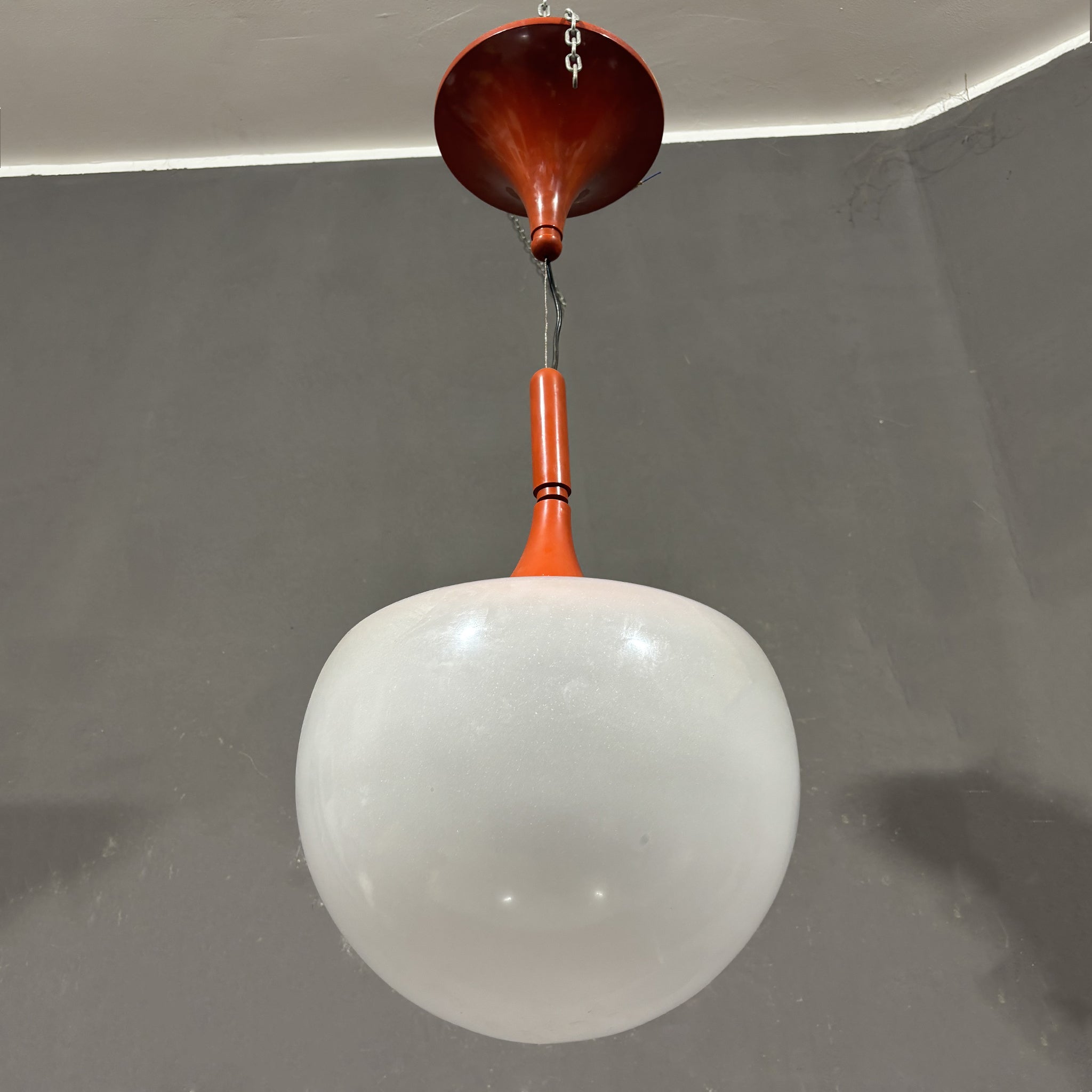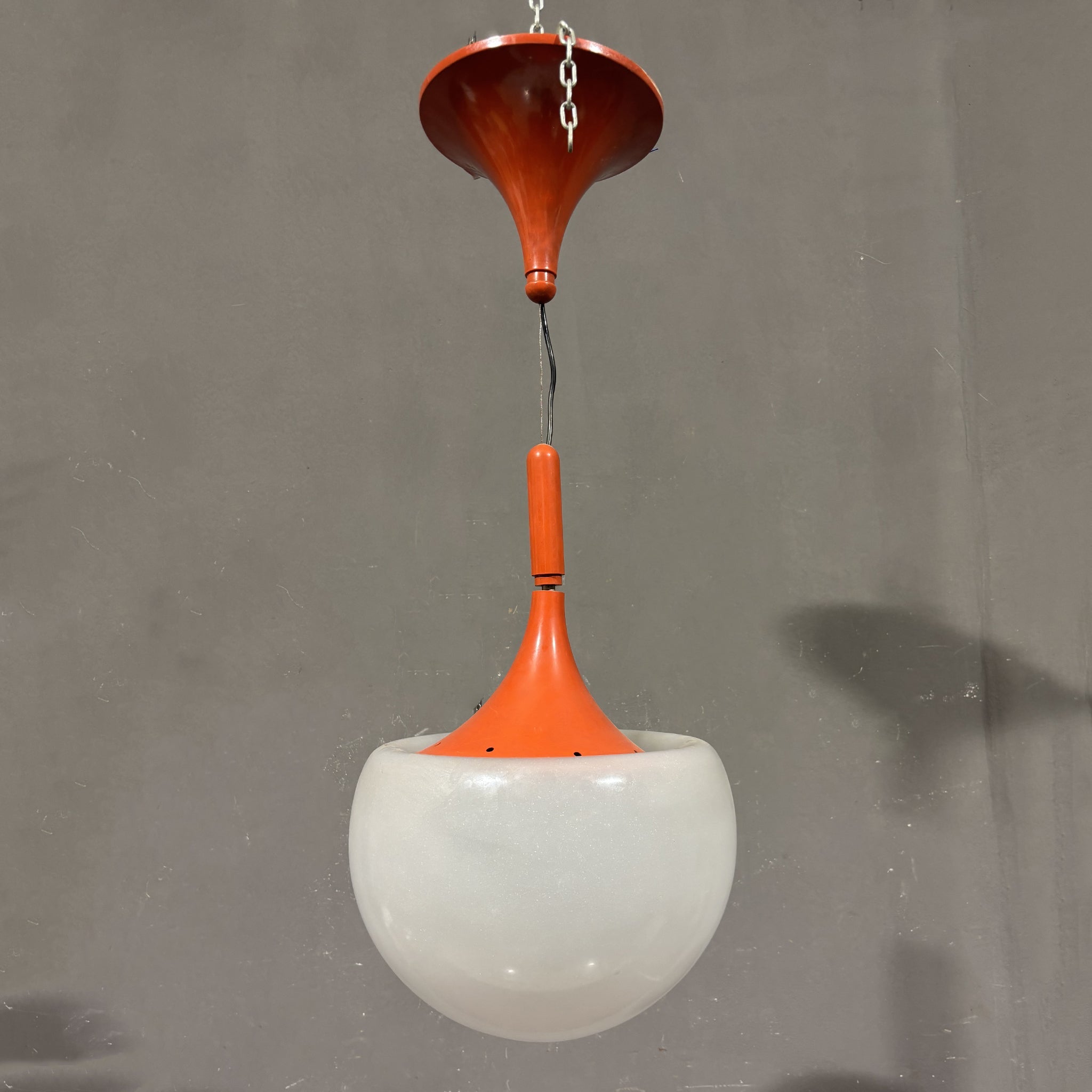 Il lampadario è composto da un elegante paralume in vetro opalino bianco di grandi dimensioni, ed è sormontato da elementi in metallo laccato arancione.