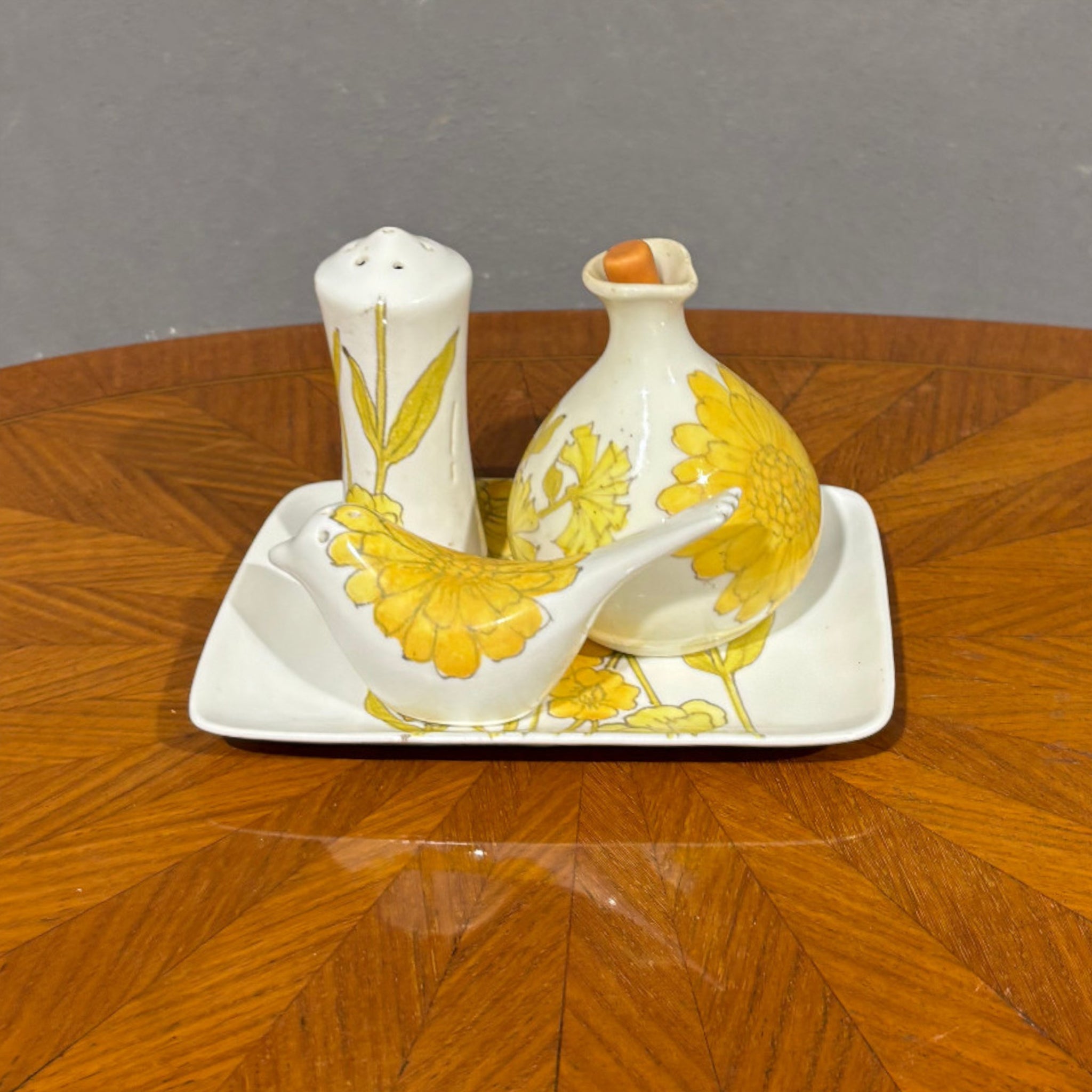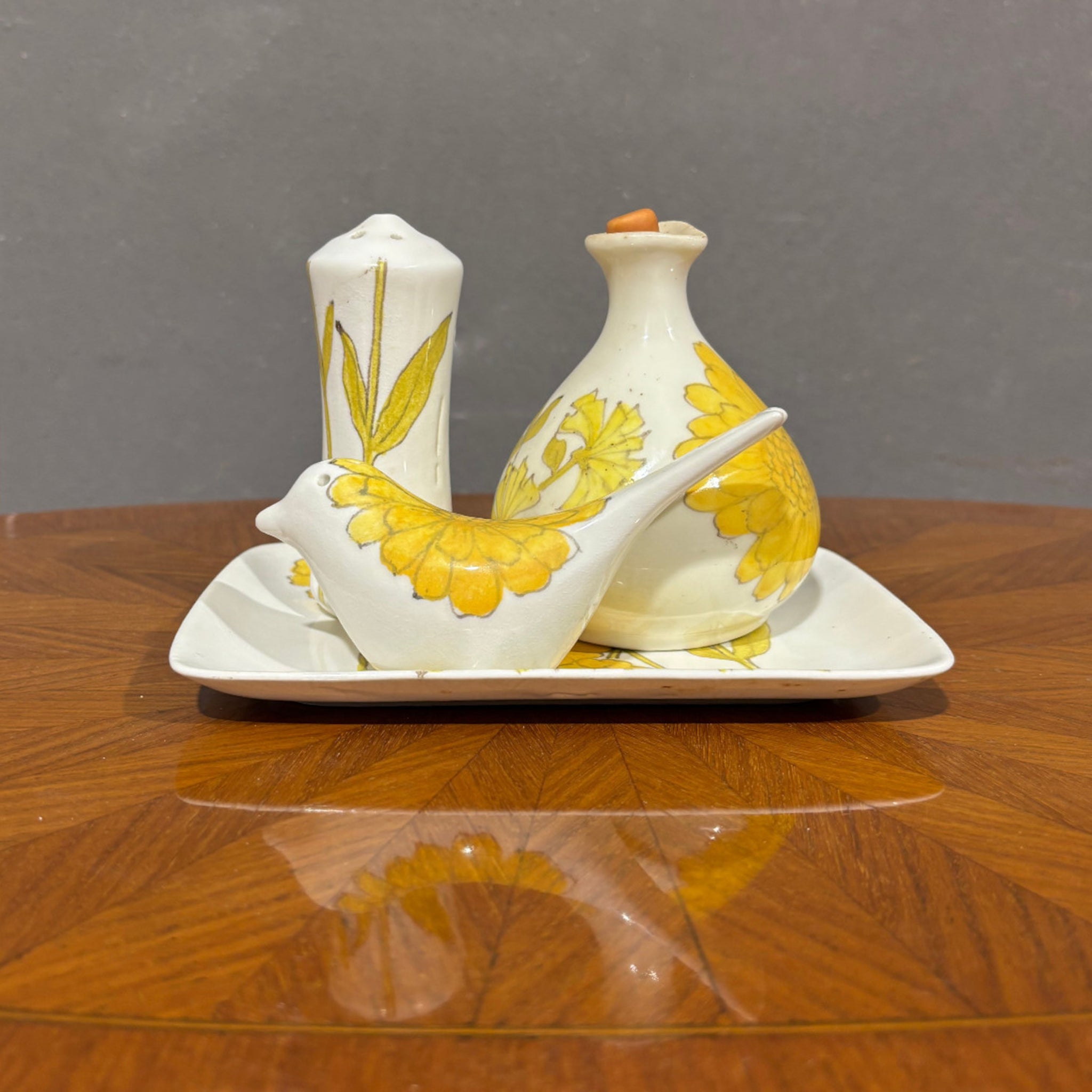 Bellissimo e raro set composto da saliera, pepiera, oliera e vassoio, interamente in ceramica Ernestine dipinta a mano, appartenente al periodo Mid-Century Italiano.