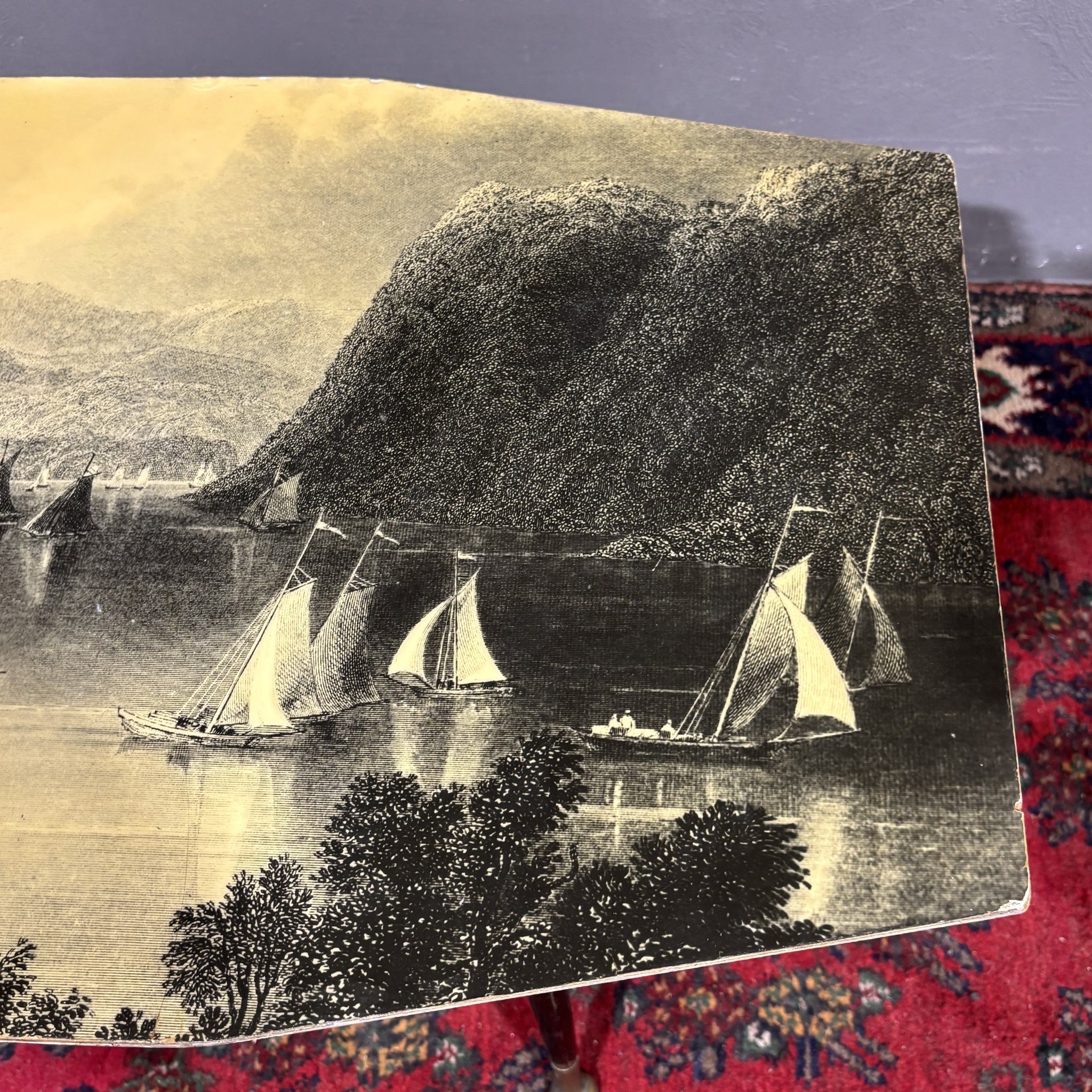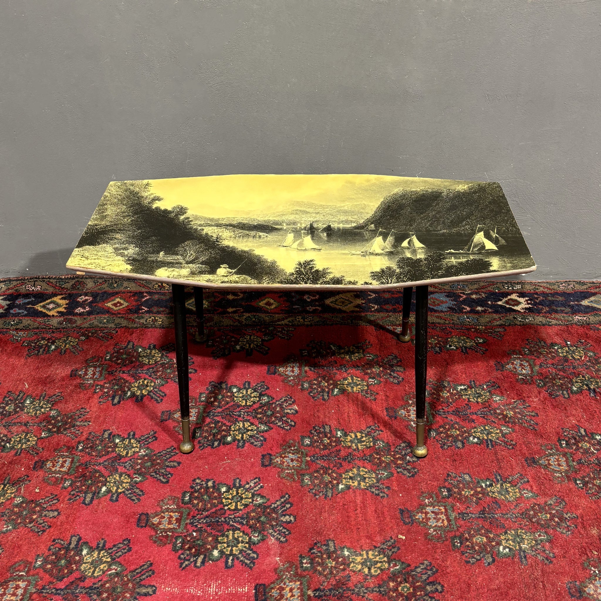 Elegante tavolino da fumo Mid-Century caratterizzato da un design pulito e minimalista tipico dell'epoca, con piano serigrafato raffigurante una scena paesaggistica e gambe in metallo.